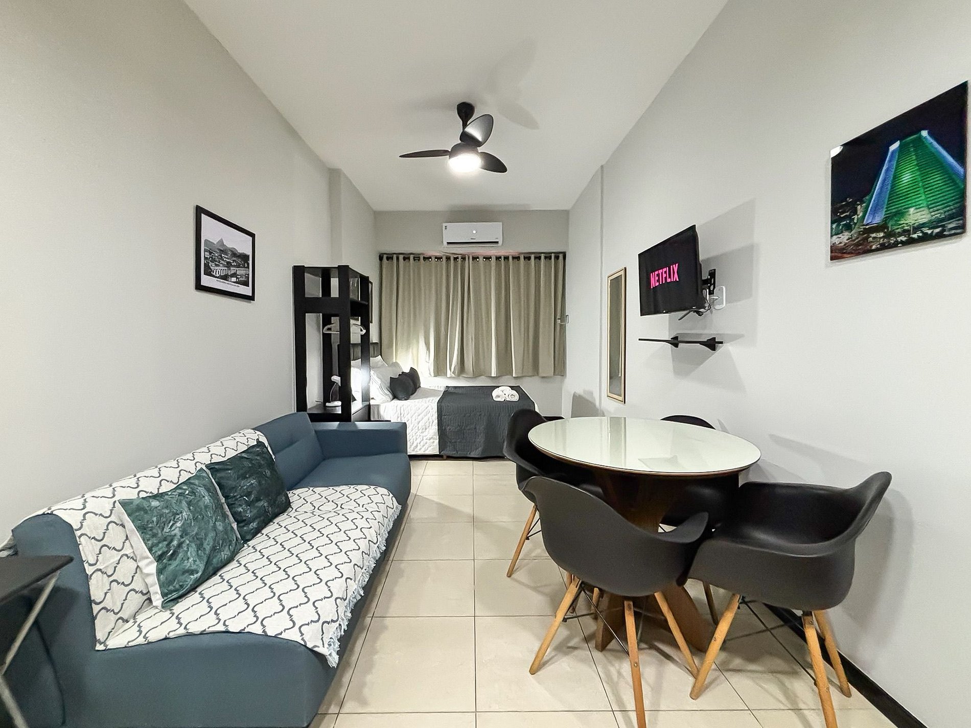 O prédio conta com portaria 24h, um Rooftop com vista incrível para a cidade e para o icônico Cristo Redentor, além uma lavanderia paga no terraço — comodidades ideais para estadias longas.