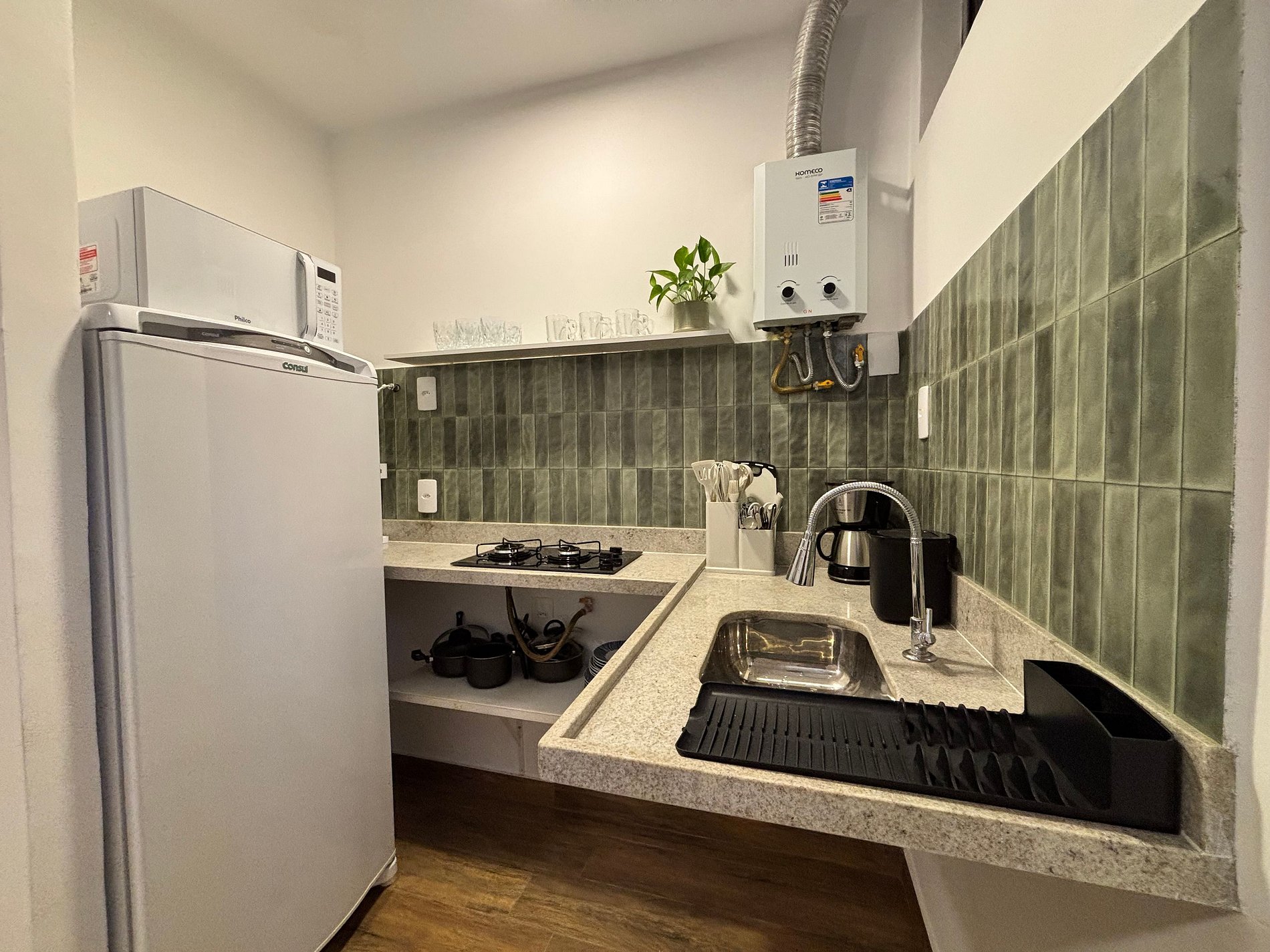 O studio foi recentemente reformado e possui uma cama confortável para até duas pessoas, uma mesa de jantar compacta e um pequeno espaço de home office — perfeito para quem precisa conciliar trabalho e viagem. A cozinha é equipada com os utensílios essenciais, o banheiro é funcional e o espaço conta com ar-condicionado, boa ventilação e Wi-Fi, tudo pensado para tornar sua estadia prática e agradável.