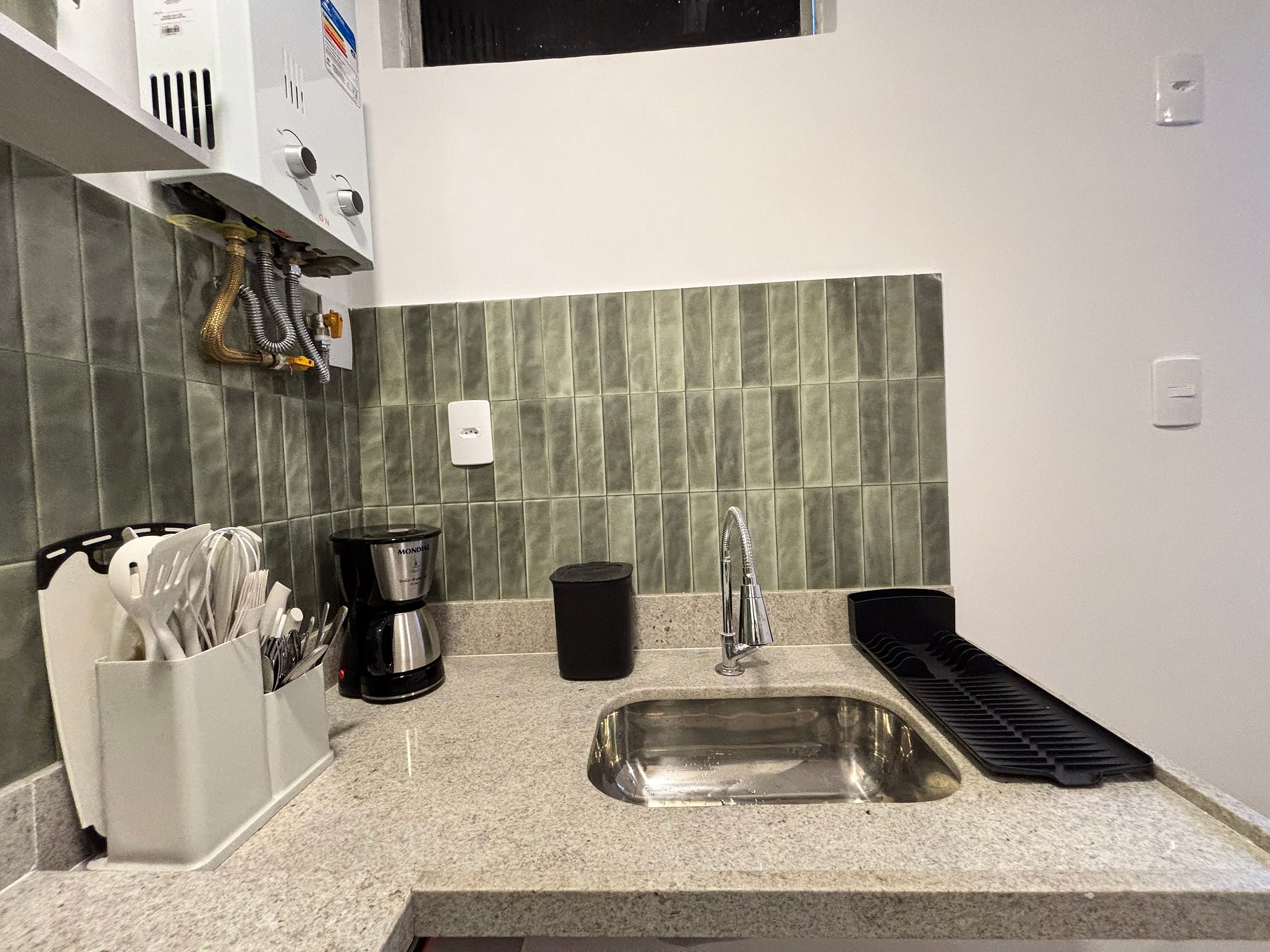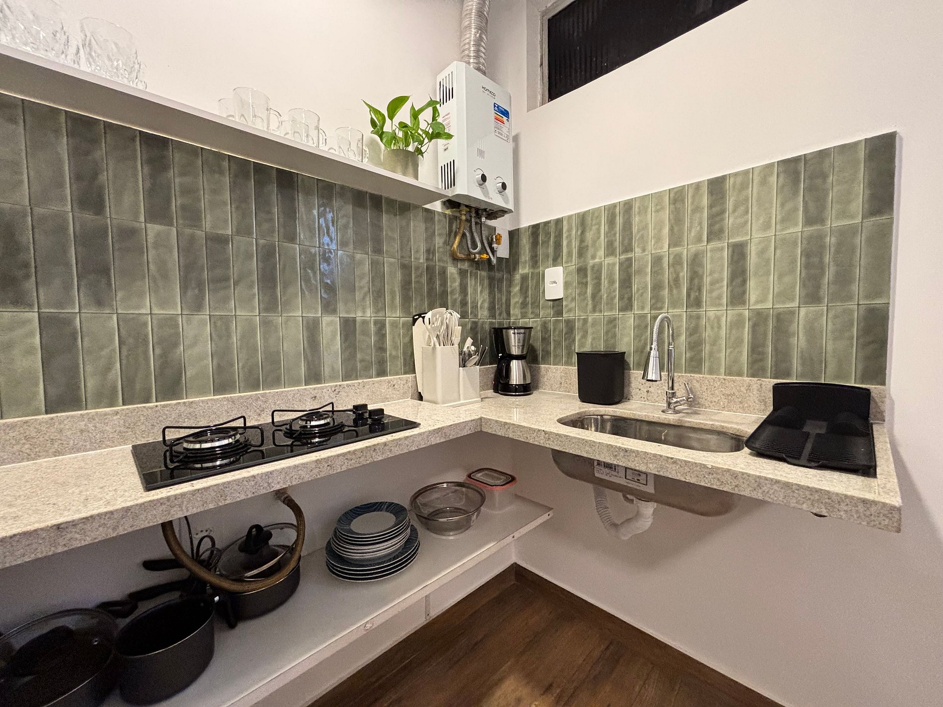 O studio foi recentemente reformado e possui uma cama confortável para até duas pessoas, uma mesa de jantar compacta e um pequeno espaço de home office — perfeito para quem precisa conciliar trabalho e viagem. A cozinha é equipada com os utensílios essenciais, o banheiro é funcional e o espaço conta com ar-condicionado, boa ventilação e Wi-Fi, tudo pensado para tornar sua estadia prática e agradável.