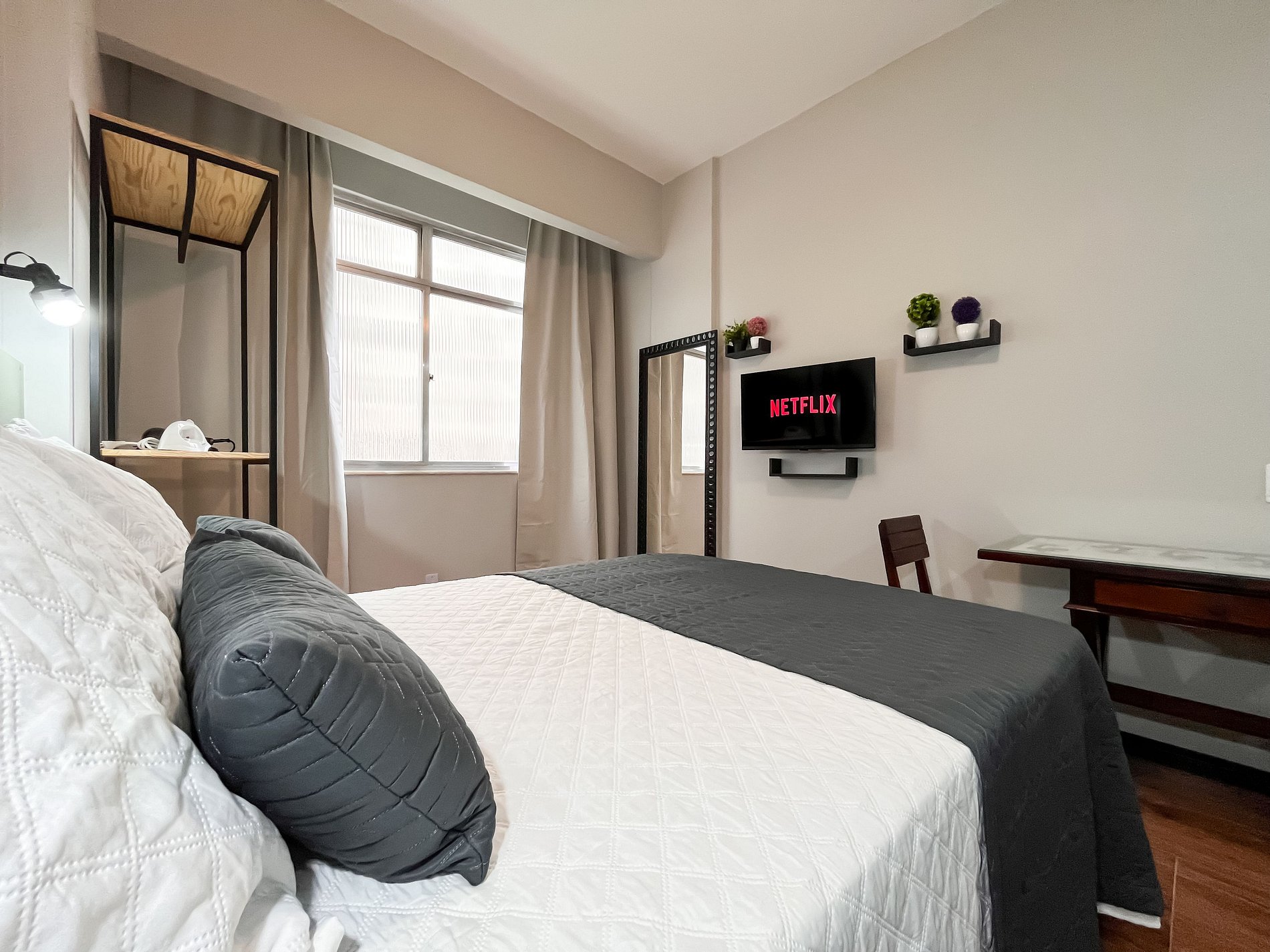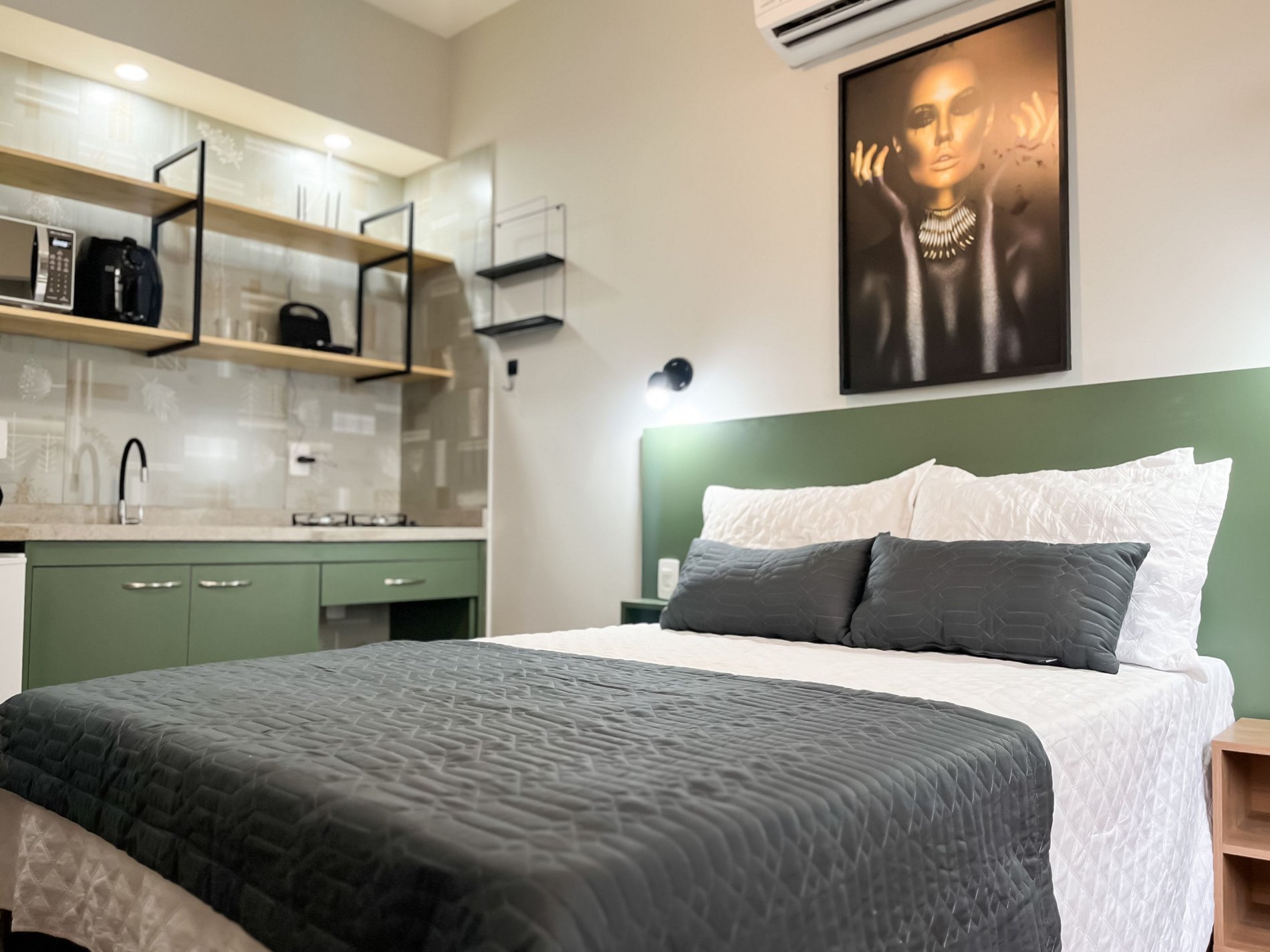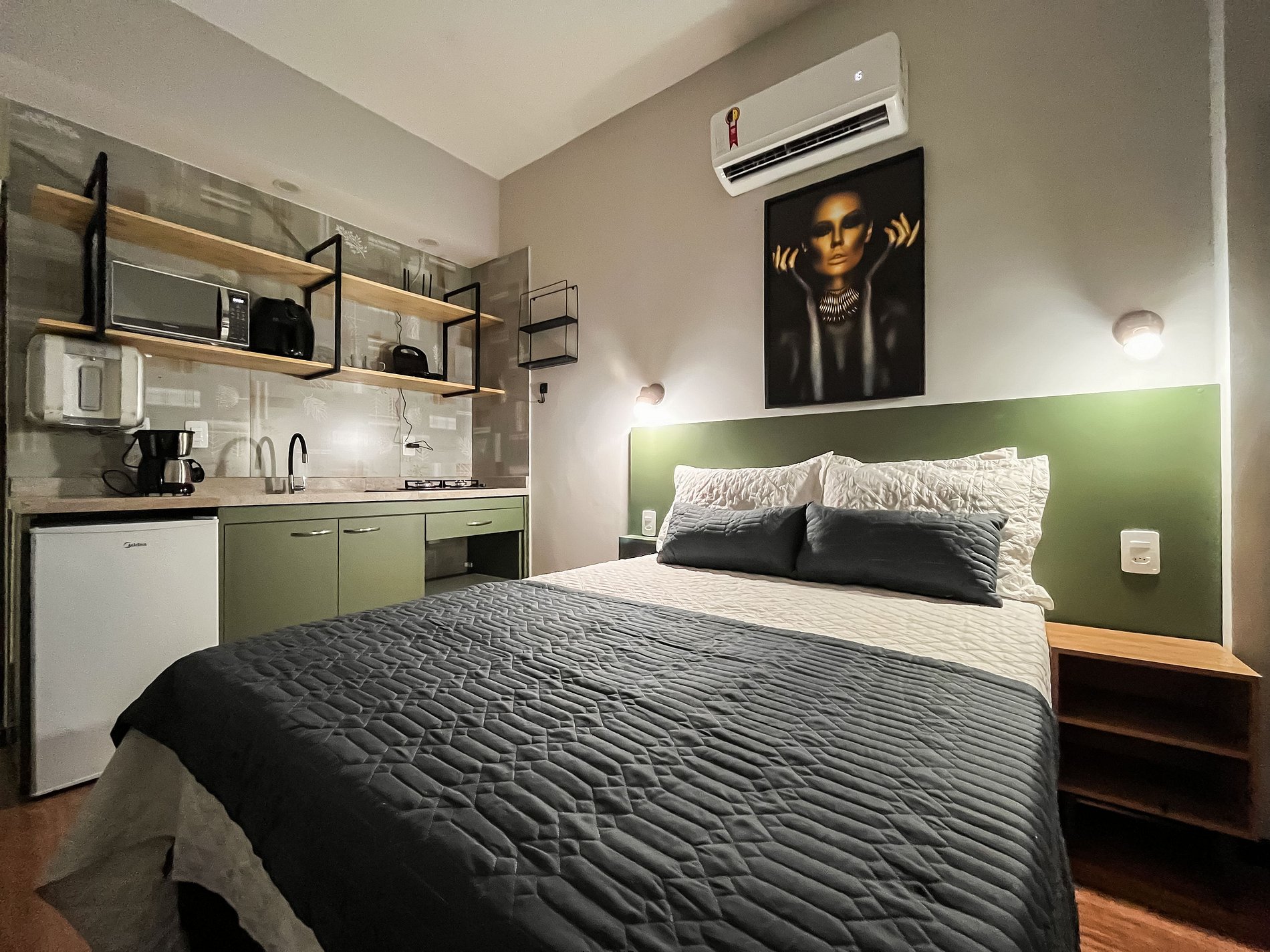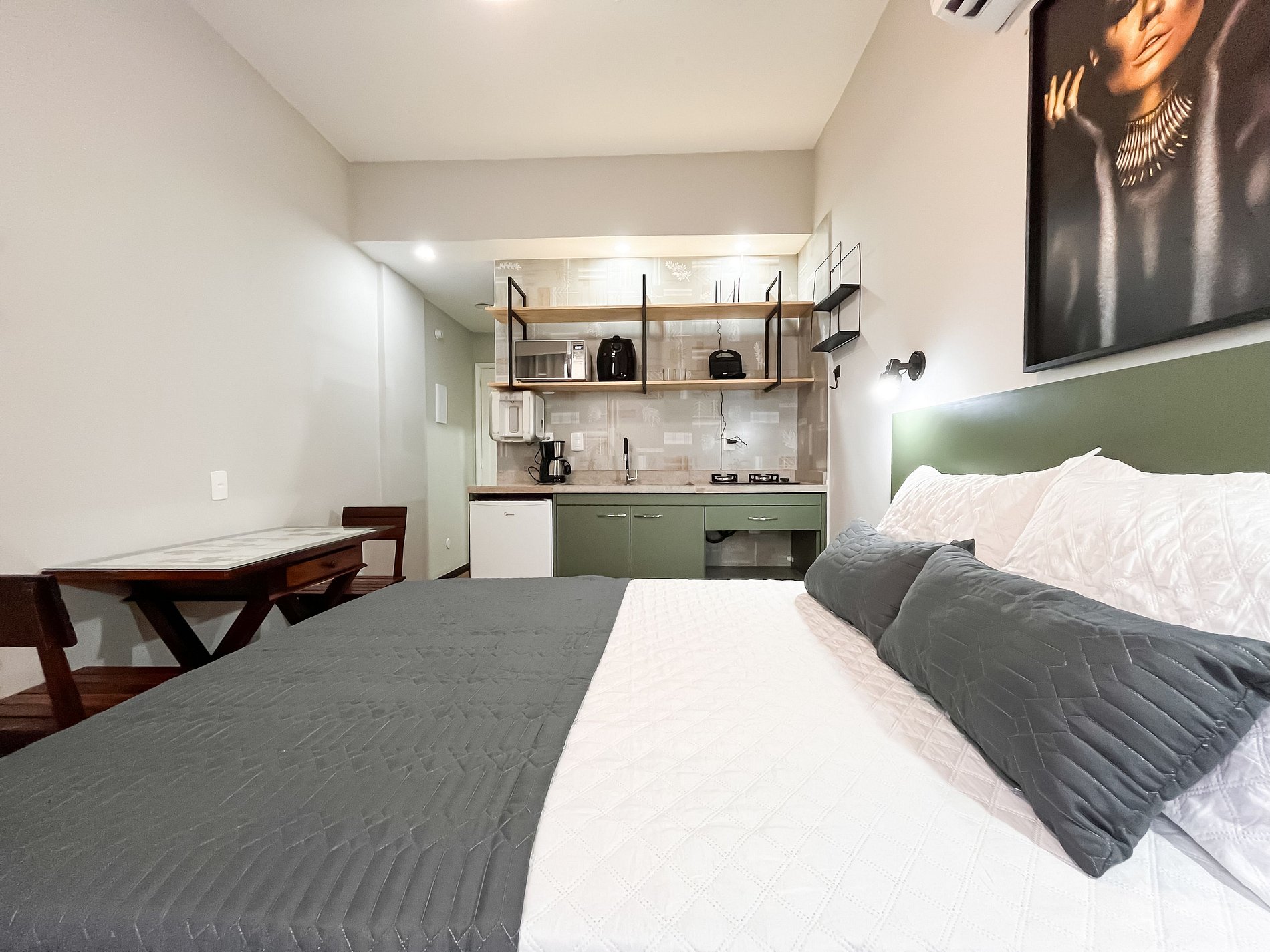 O espaço acomoda confortavelmente até duas pessoas, sendo perfeito para casais, viajantes a passeio ou a trabalho.