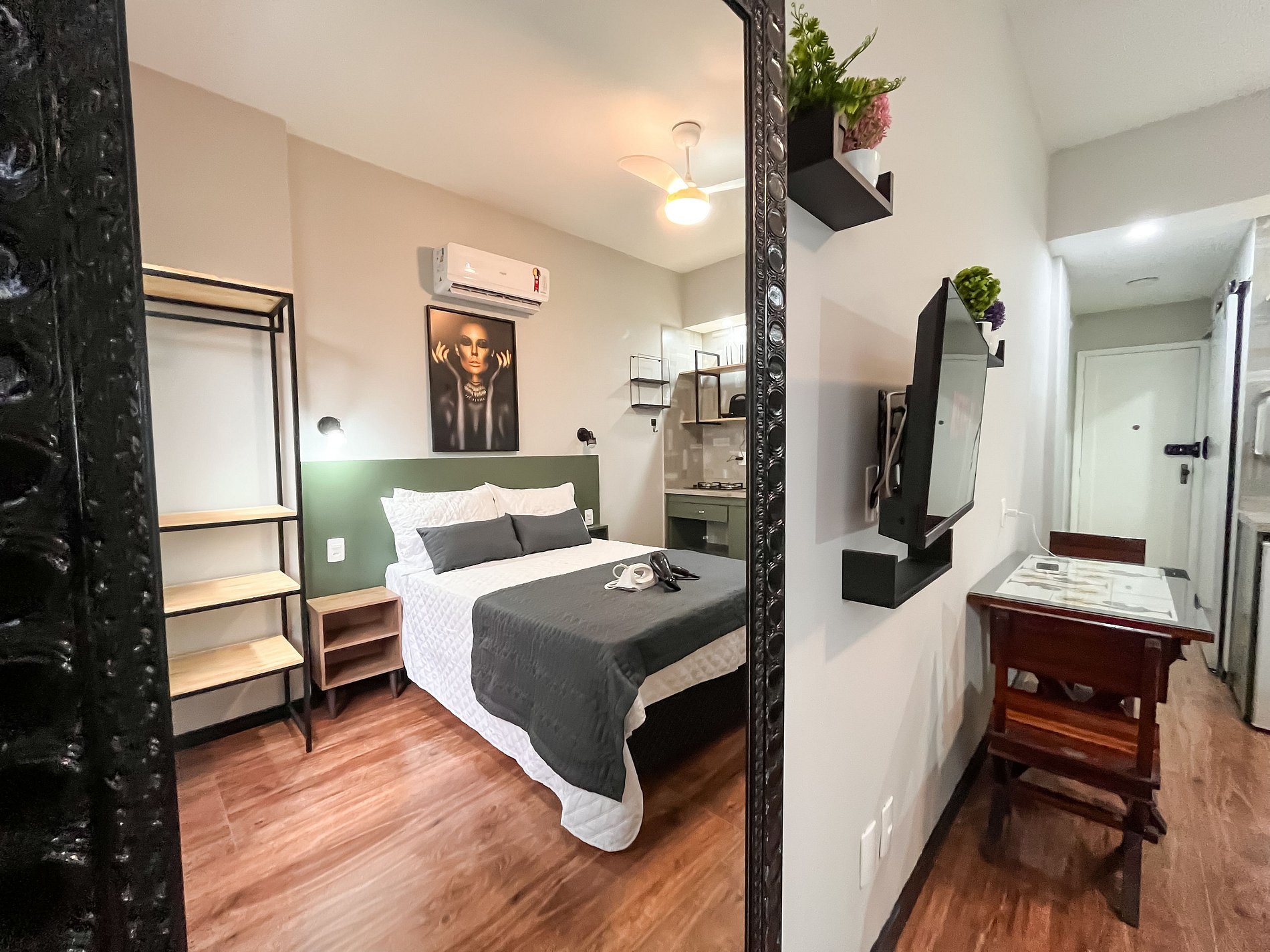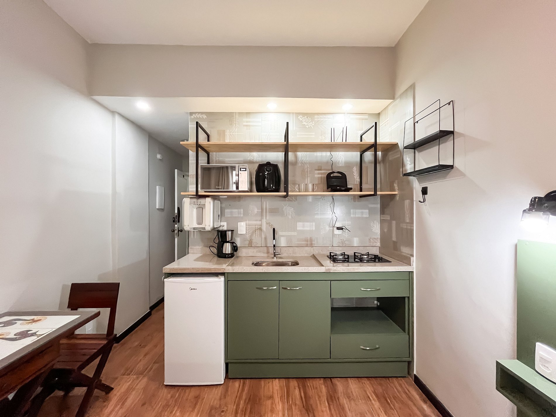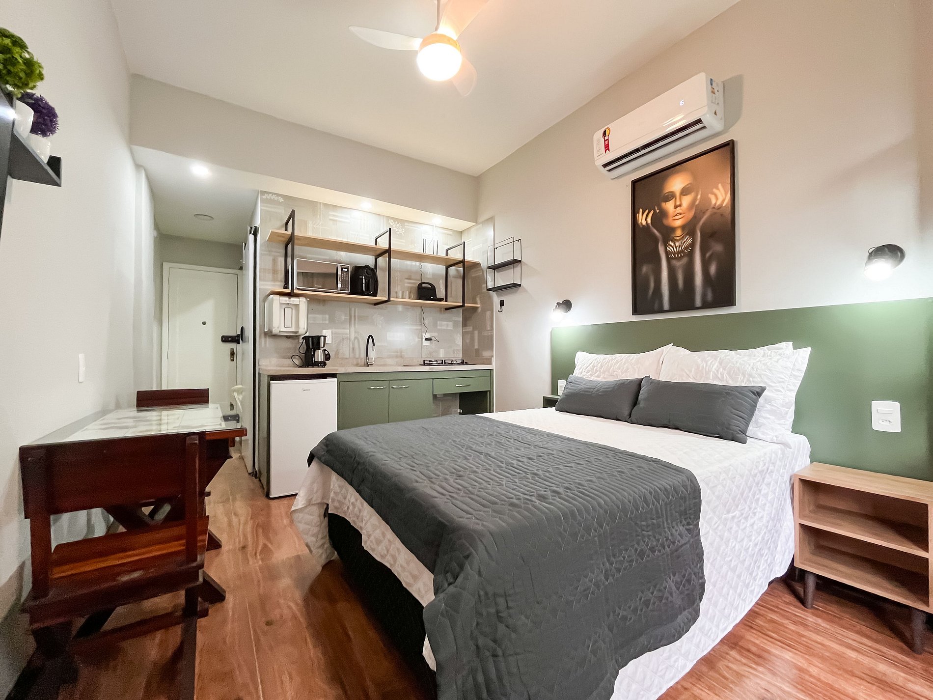 O apartamento dispõe de uma cama de casal, banheiro, mesa de jantar para duas pessoas e uma cozinha compacta equipada com os utensílios essenciais, permitindo que o hóspede prepare refeições simples após um dia explorando a cidade maravilhosa.