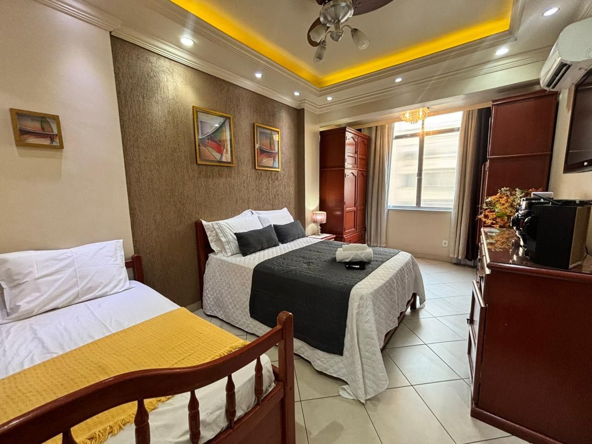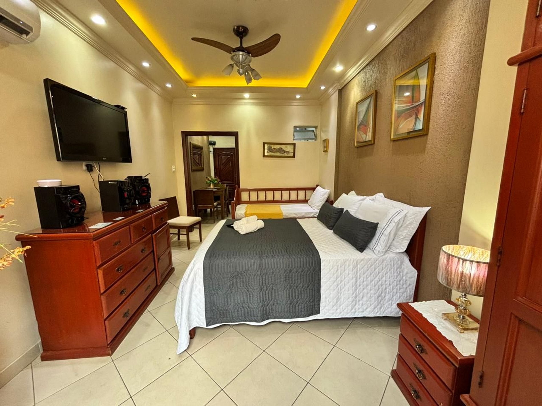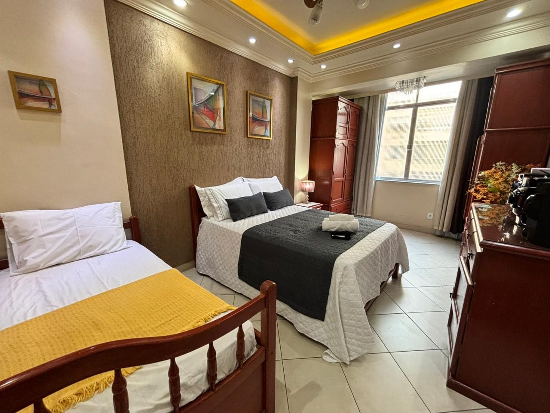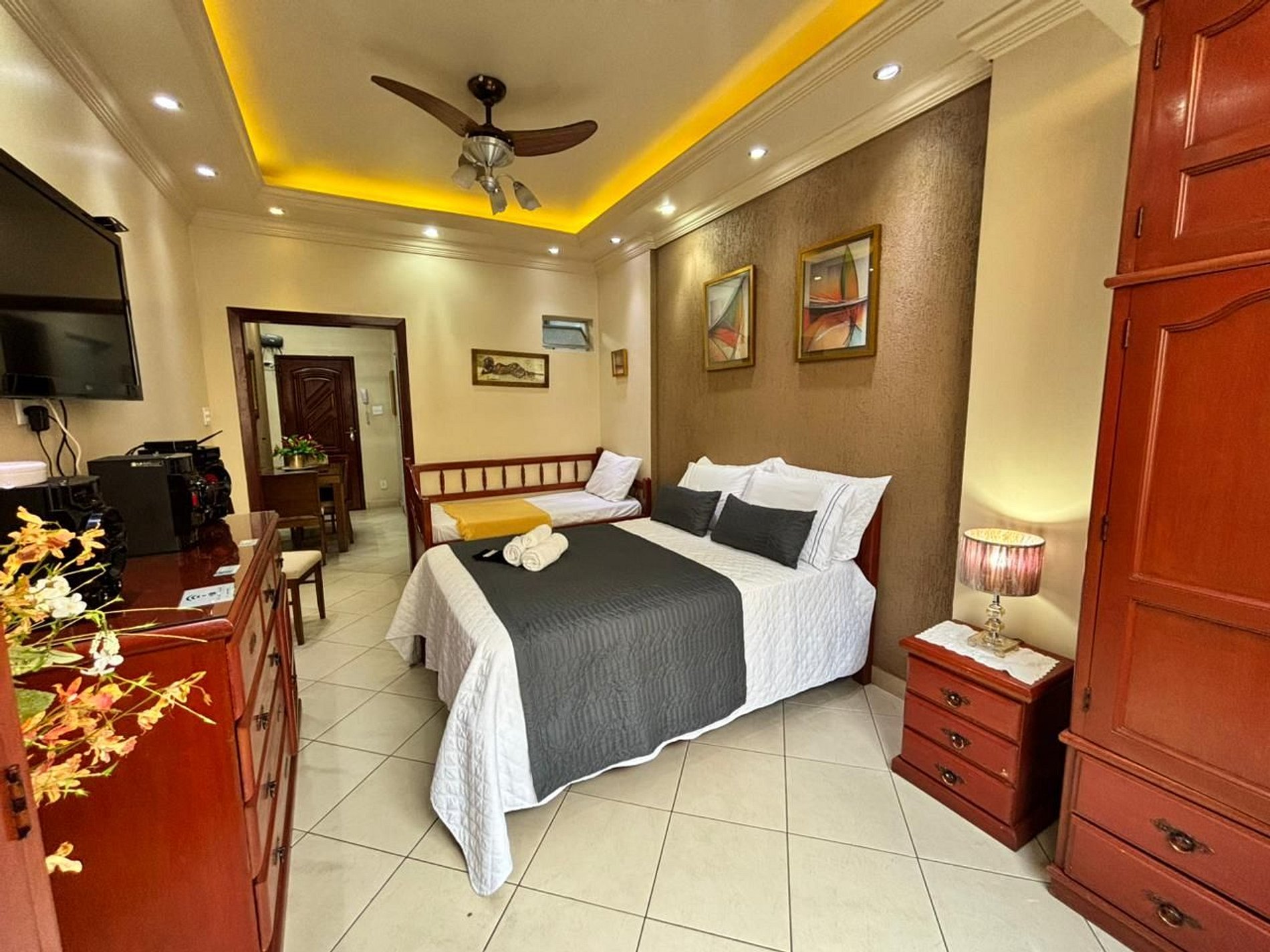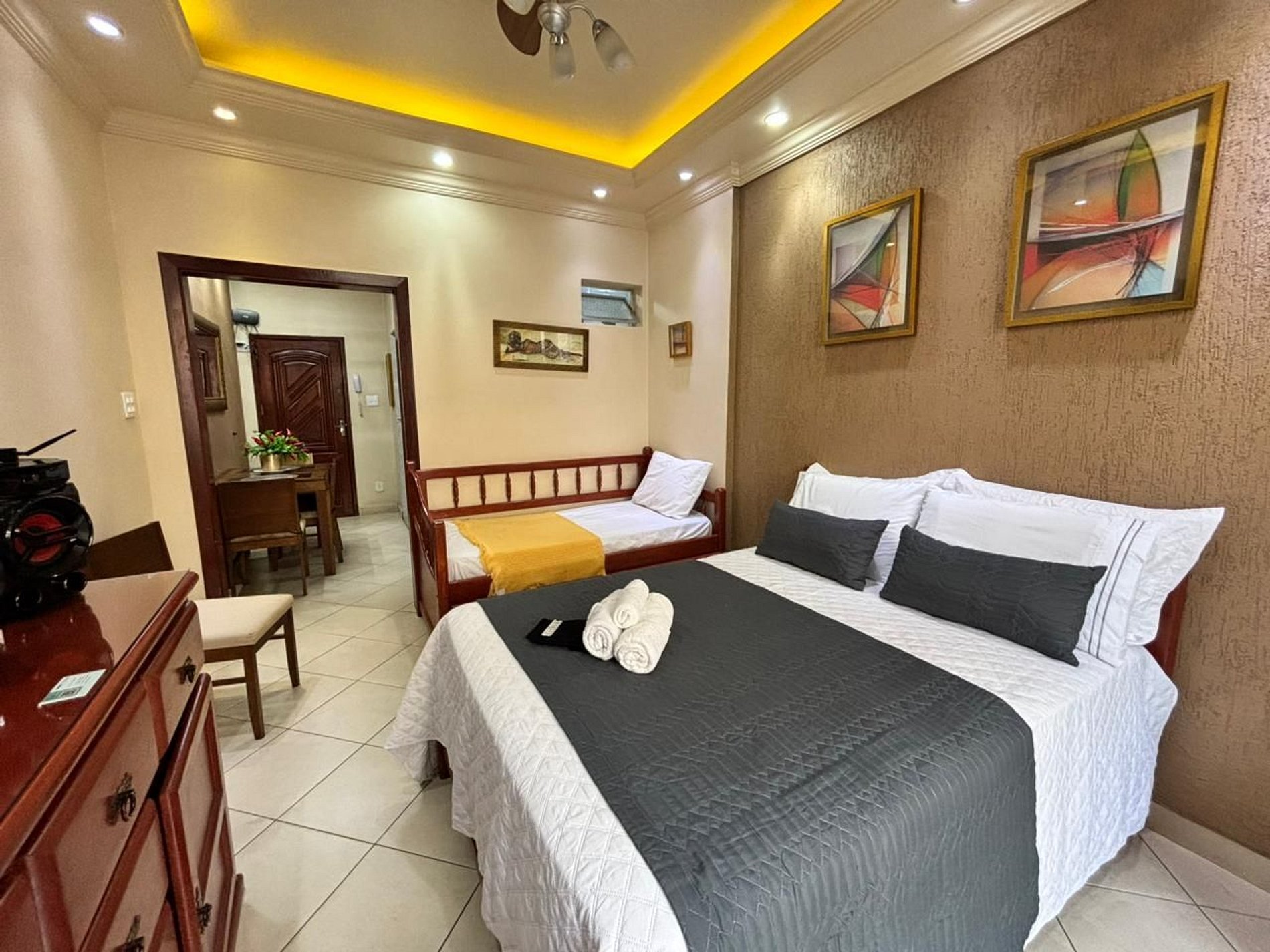 O apartamento conta com uma cama de casal espaçosa e uma bicama de solteiro versátil permitindo que comportemos até 4 pessoas.