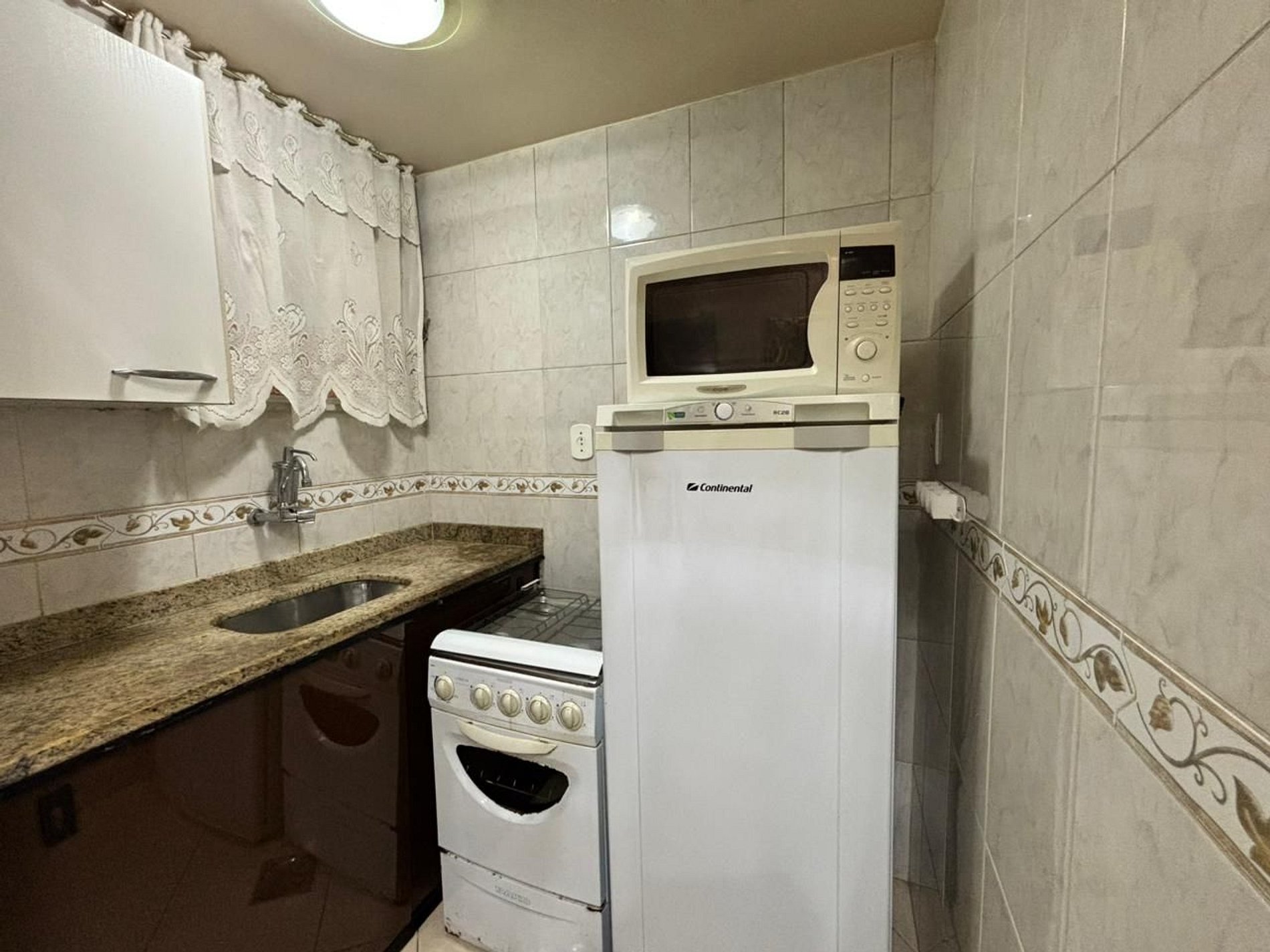 A cozinha compacta possui os principais utensílios, fogão, geladeira e mesa de jantar para refeições rápidas e simples.