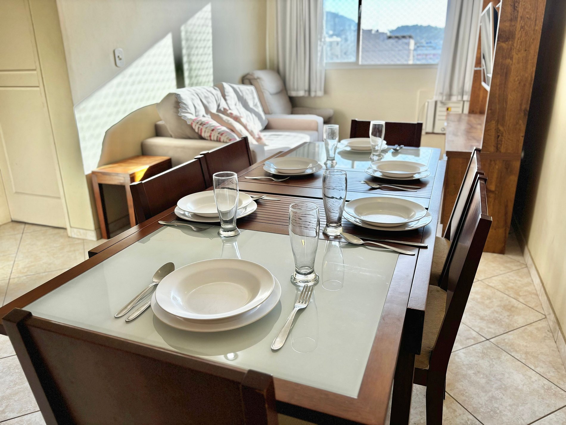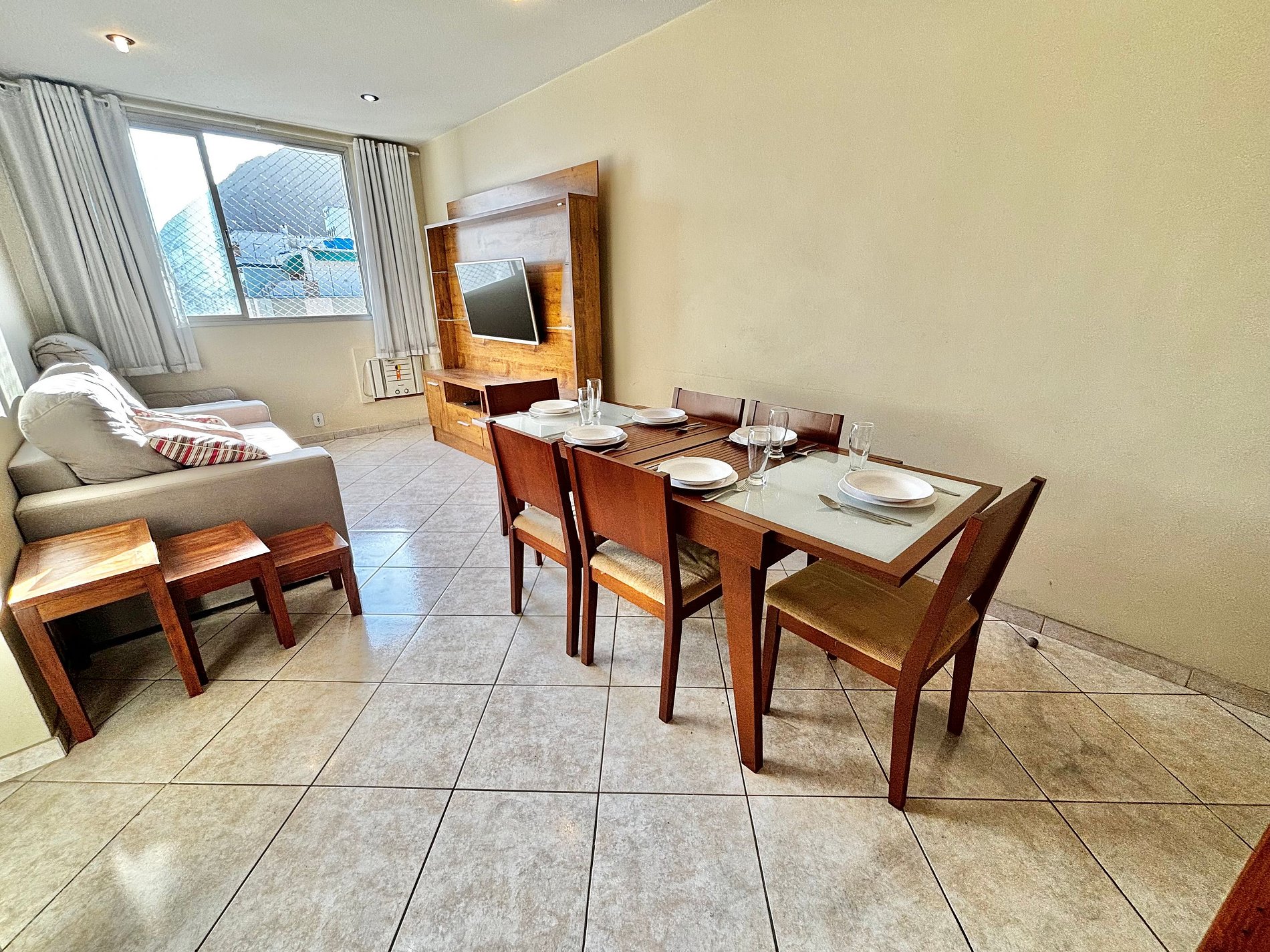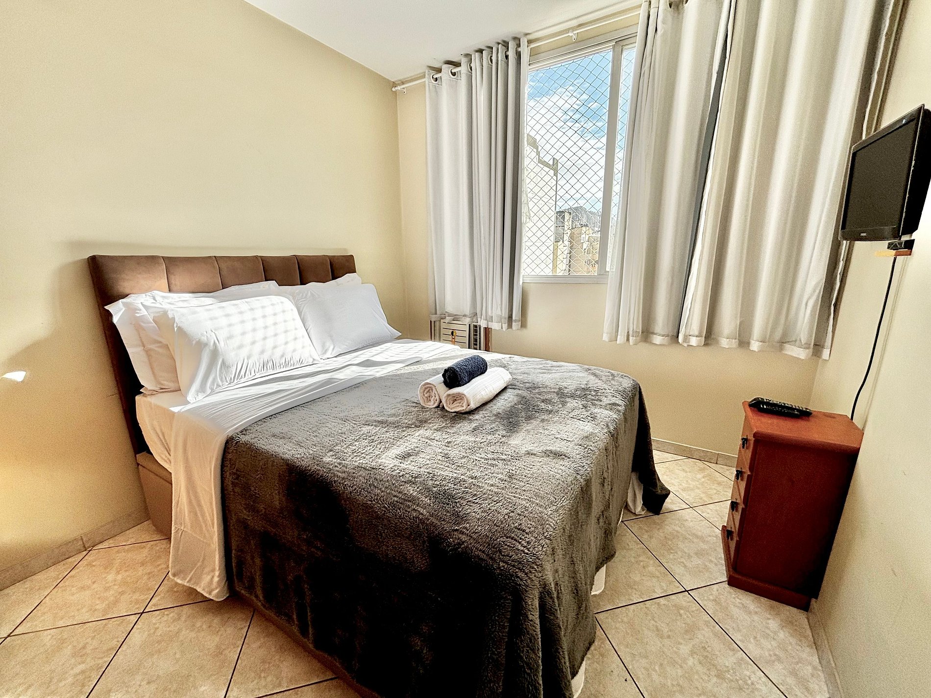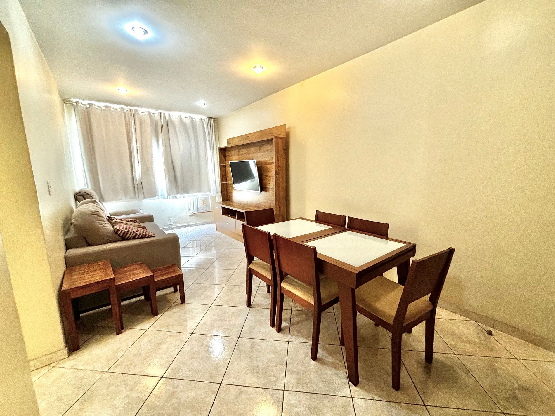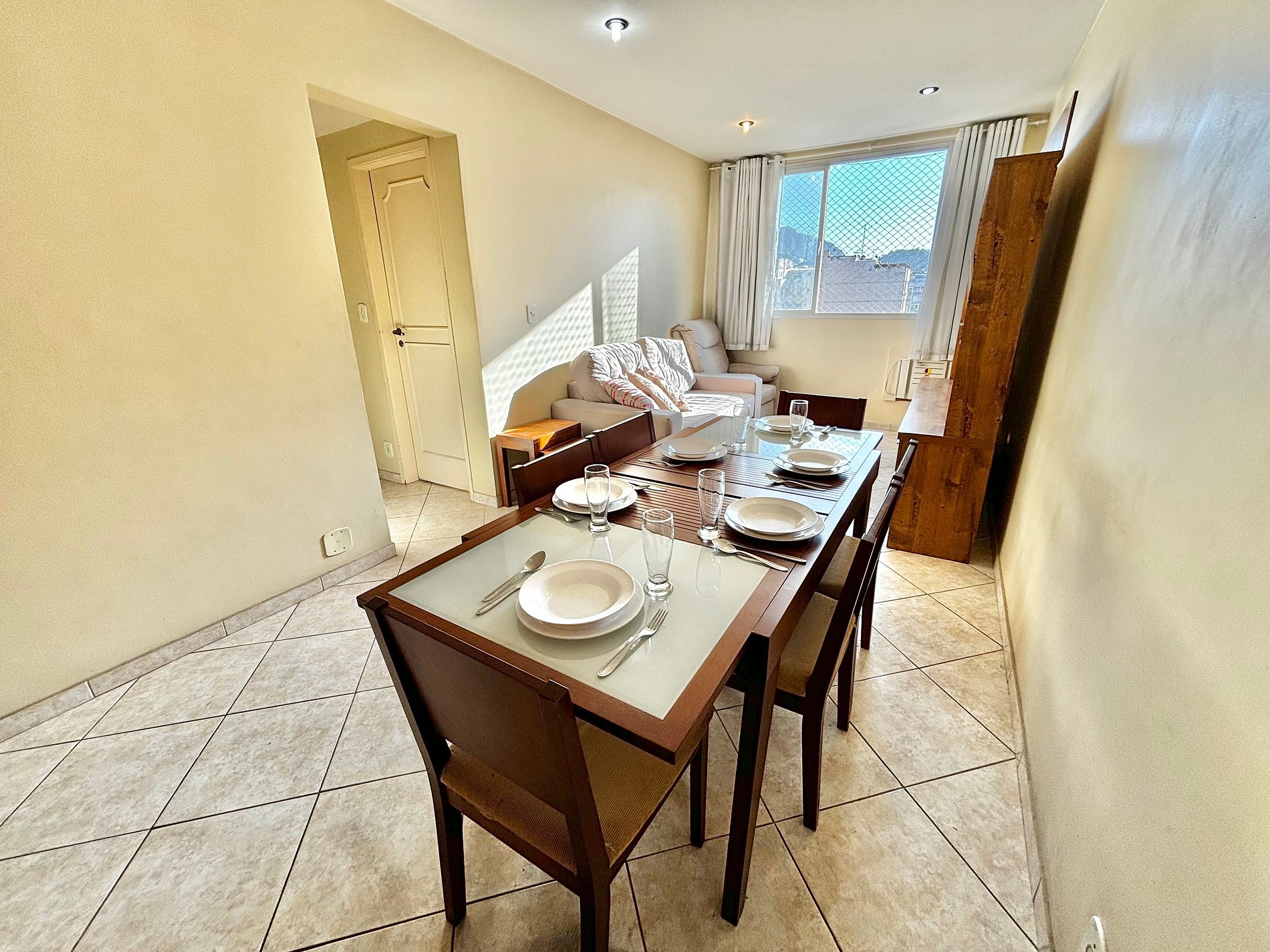 Nosso apartamento comporta confortavelmente até 4 pessoas, pois conta com dois quartos, sendo um deles uma suíte, banheiro, uma sala de estar que possuí uma mesa de jantar de 6 lugares, área de serviço e uma espaçosa cozinha que te permitirá preparar pratos incríveis para os seus amigos e familiares após um dia de passeio pela cidade maravilhosa