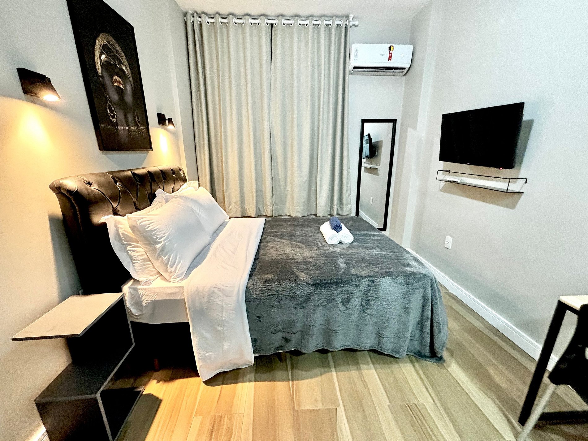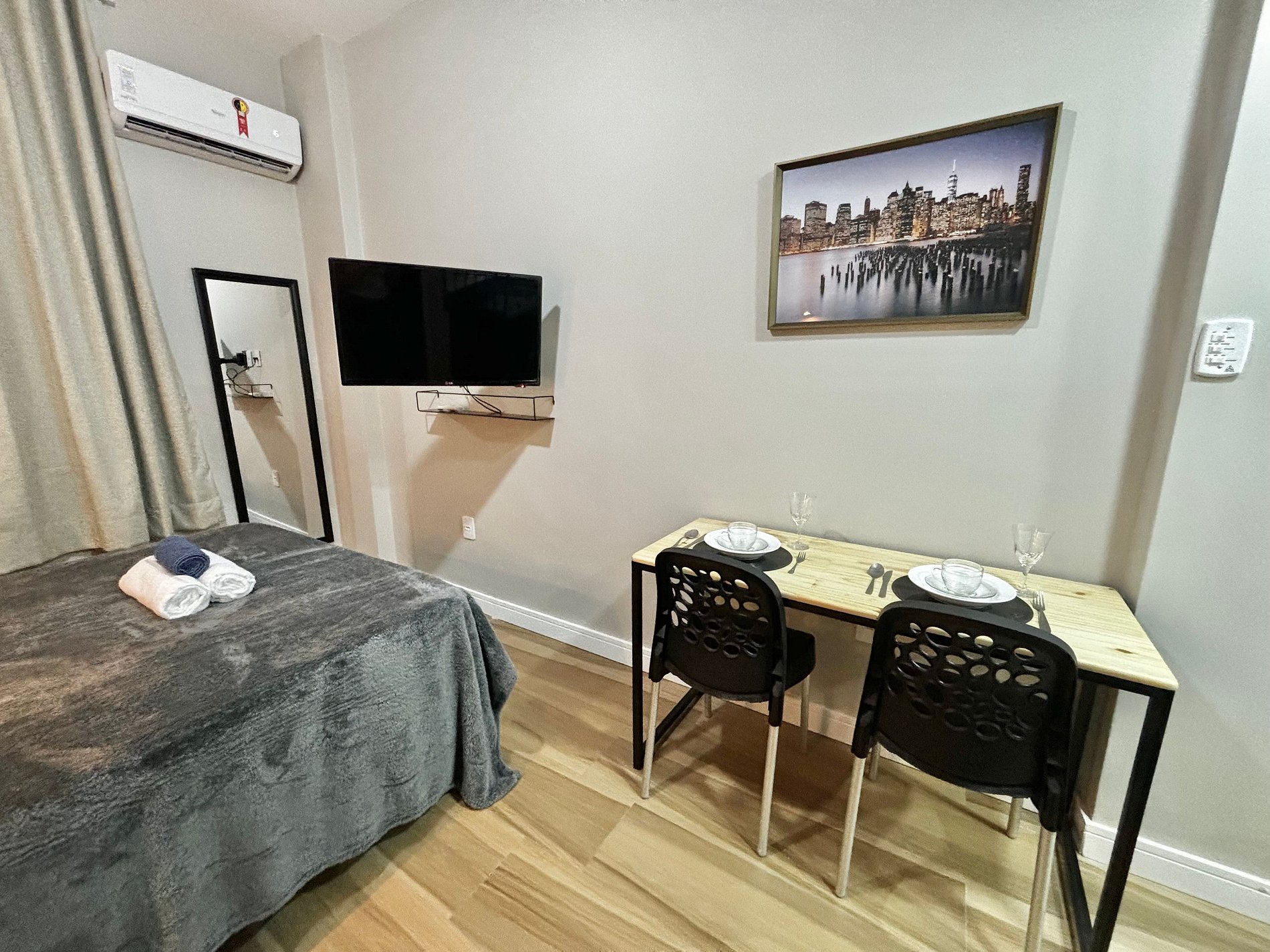 Possuímos uma cozinha compacta, mas com todos os utensílios necessários para preparar uma ótima refeição após um dia de passeio pelo Rio. Além disso nosso Studio conta com uma cama de casal, Smart Tv, Ar condicionado e uma mesinha que pode ser usada tanto para suas refeições quanto para o seu home office.