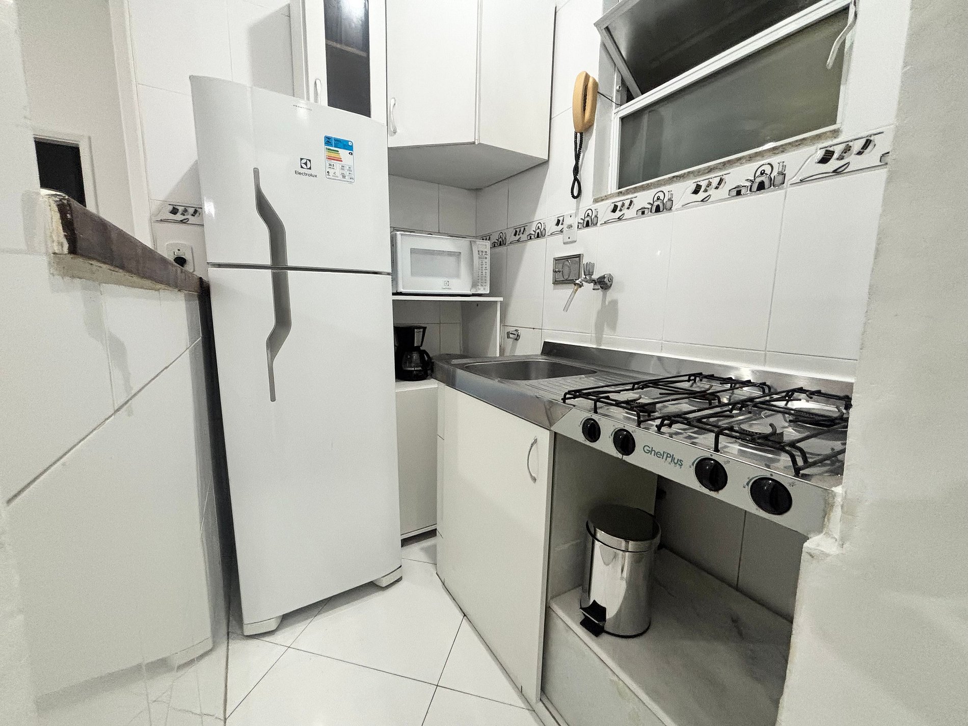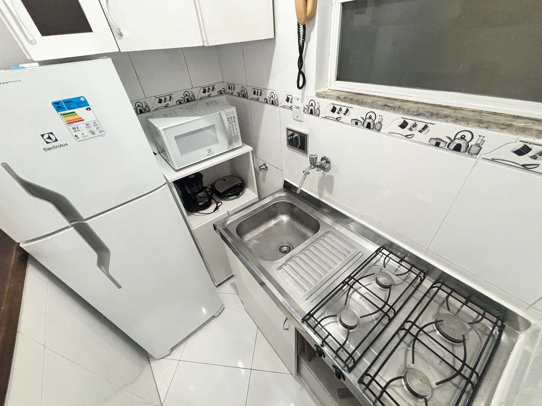 Possuímos também uma cozinha compacta e prática para que você possa preparar suas refeições após um longo dia de passeio pela cidade maravilhosa.