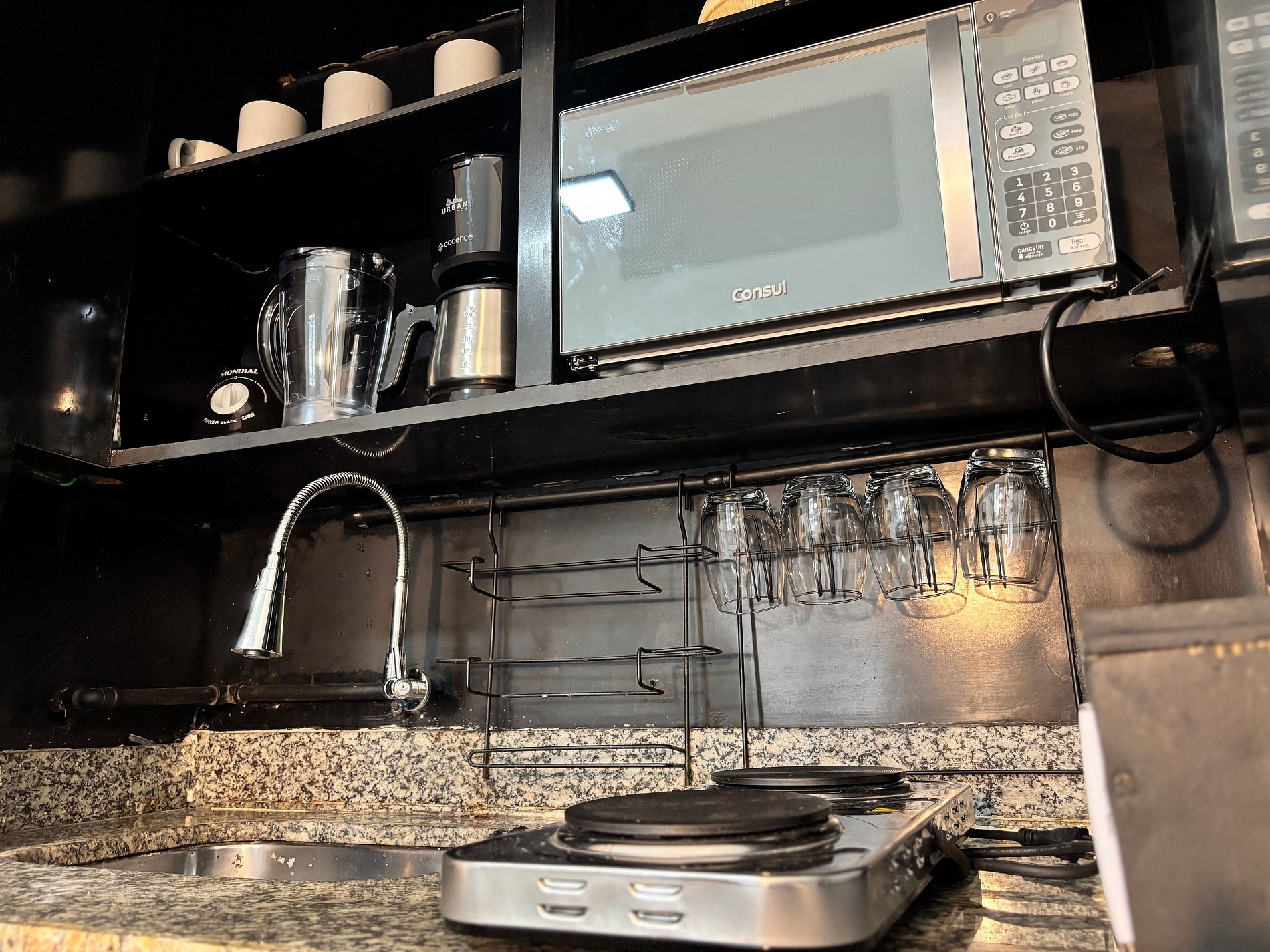 Possuímos uma cama de casal, sofá cama, mesa de jantar, banheiro privativo, e uma cozinha compacta porém com todos os utensílios básicos para que você consiga preparar as suas refeições após um dia intenso de passeio pela cidade maravilhosa.