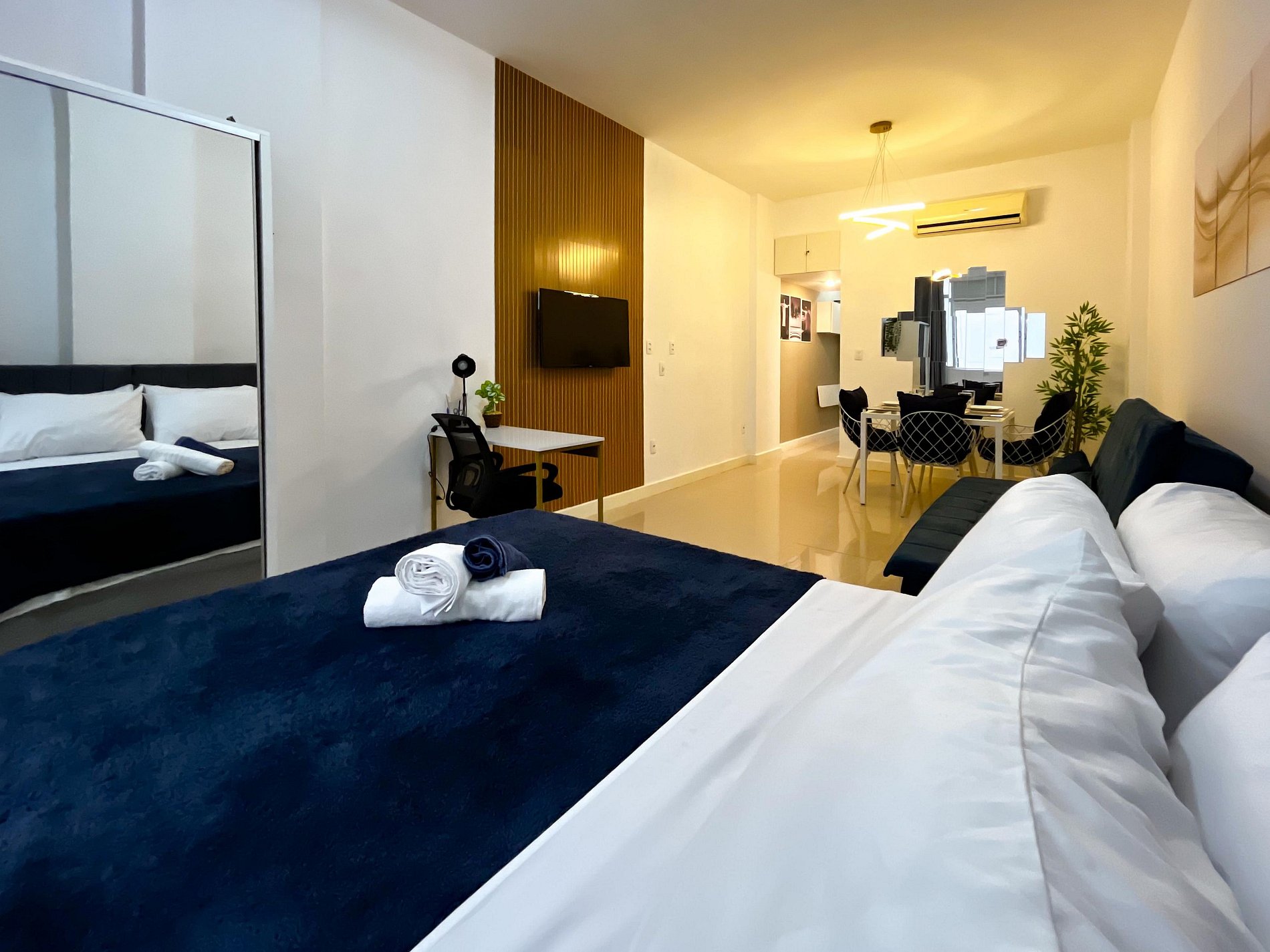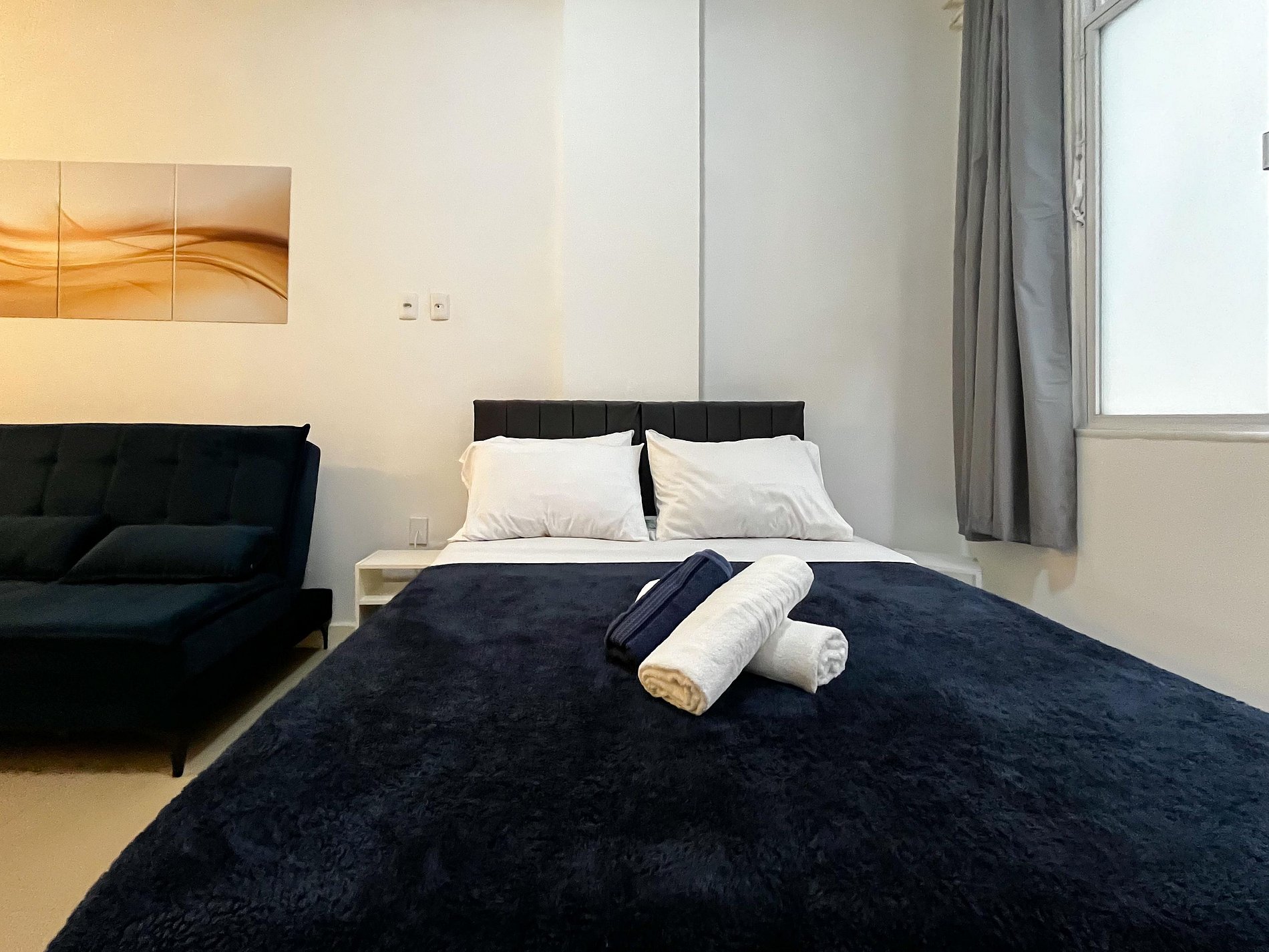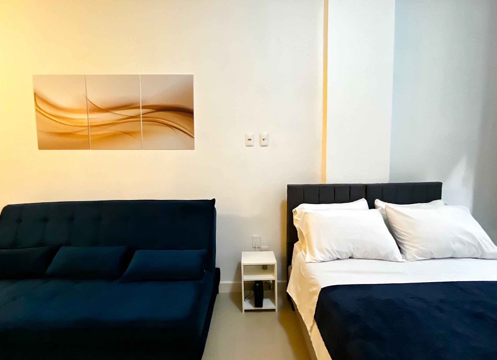 O studio comporta até 3 pessoas, oferecendo uma cama de casal e um sofá-cama, se tornando o local ideal para quem viaja em grupo ou sozinho.