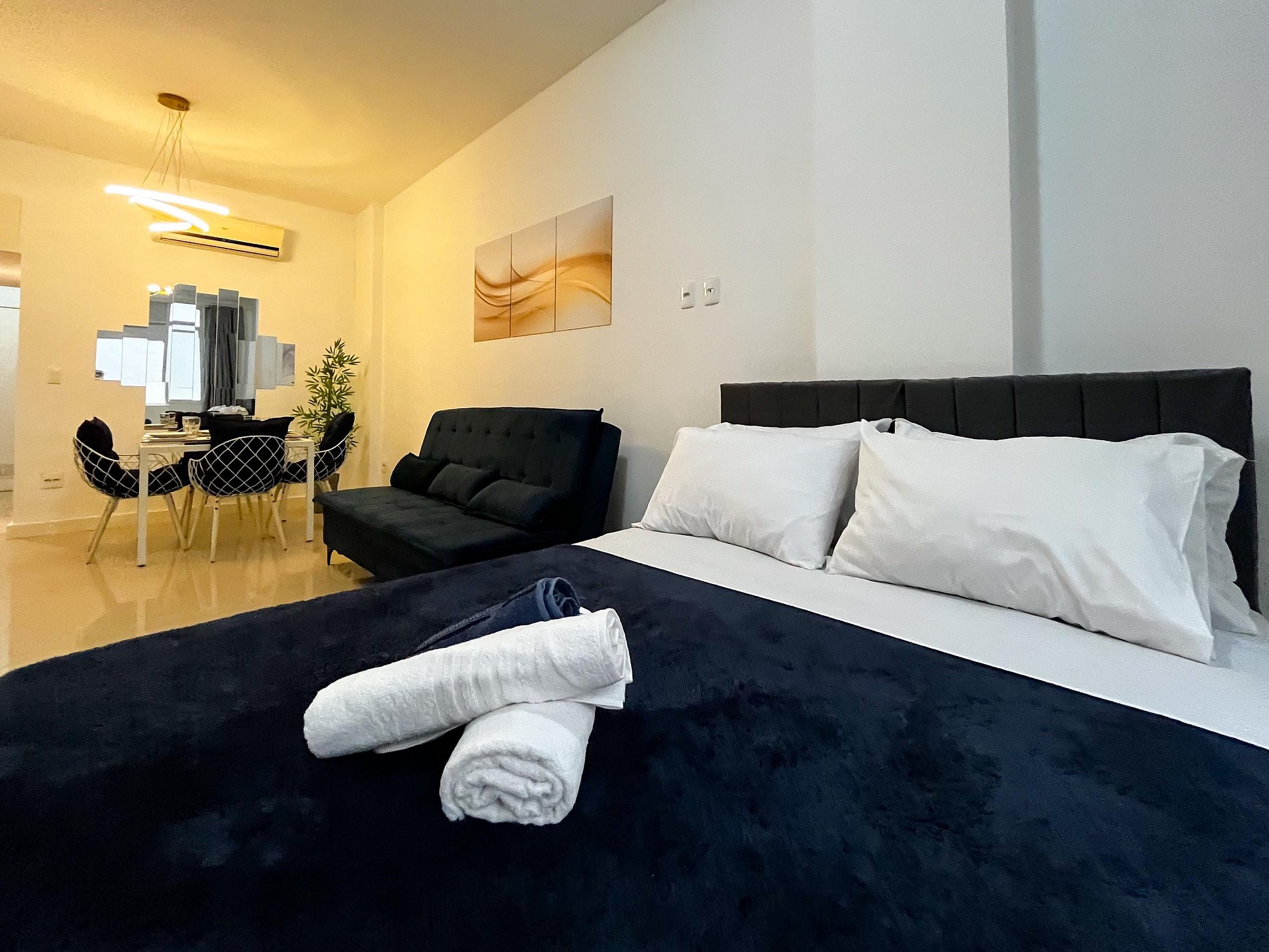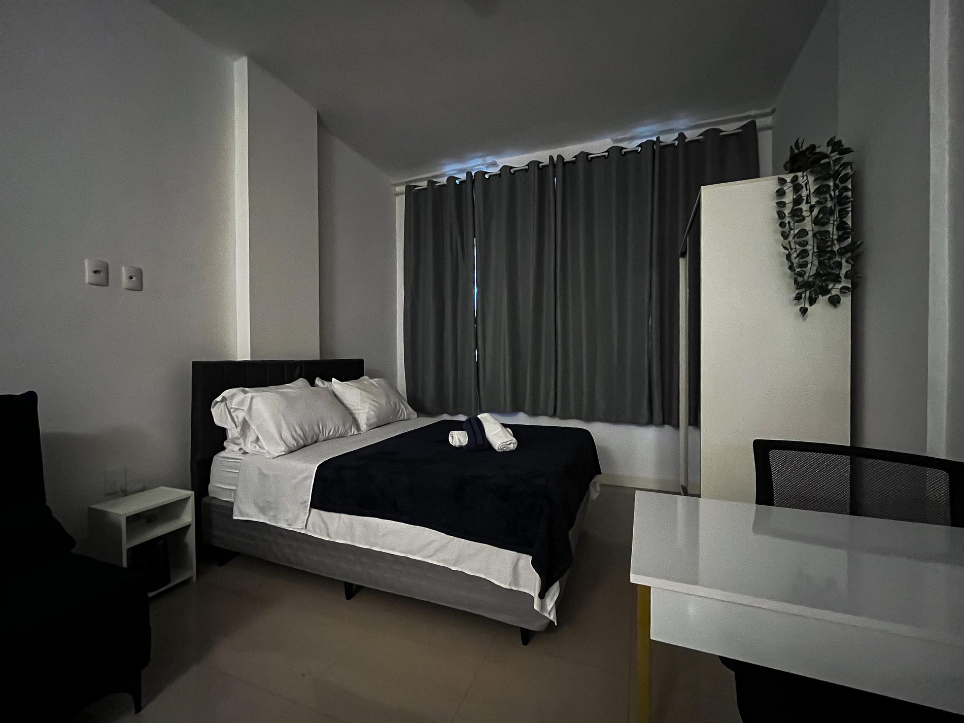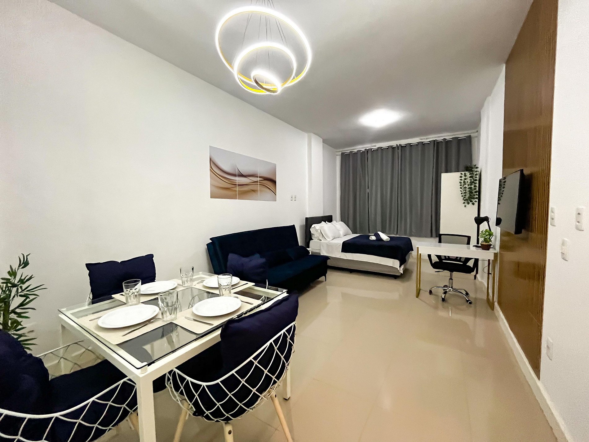 O studio comporta até 3 pessoas, oferecendo uma cama de casal e um sofá-cama, se tornando o local ideal para quem viaja em grupo ou sozinho.