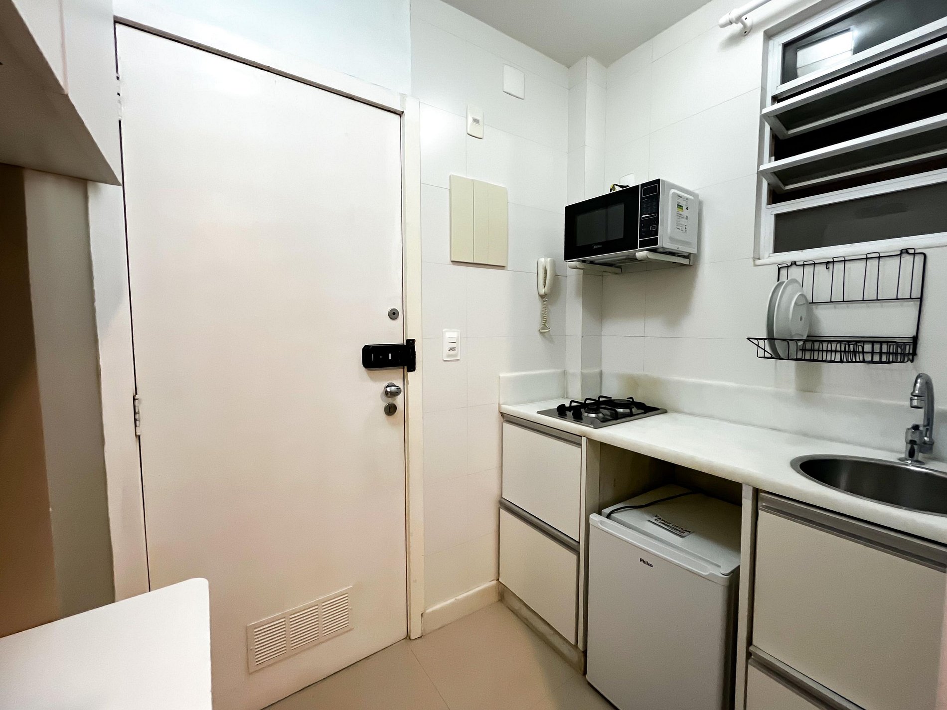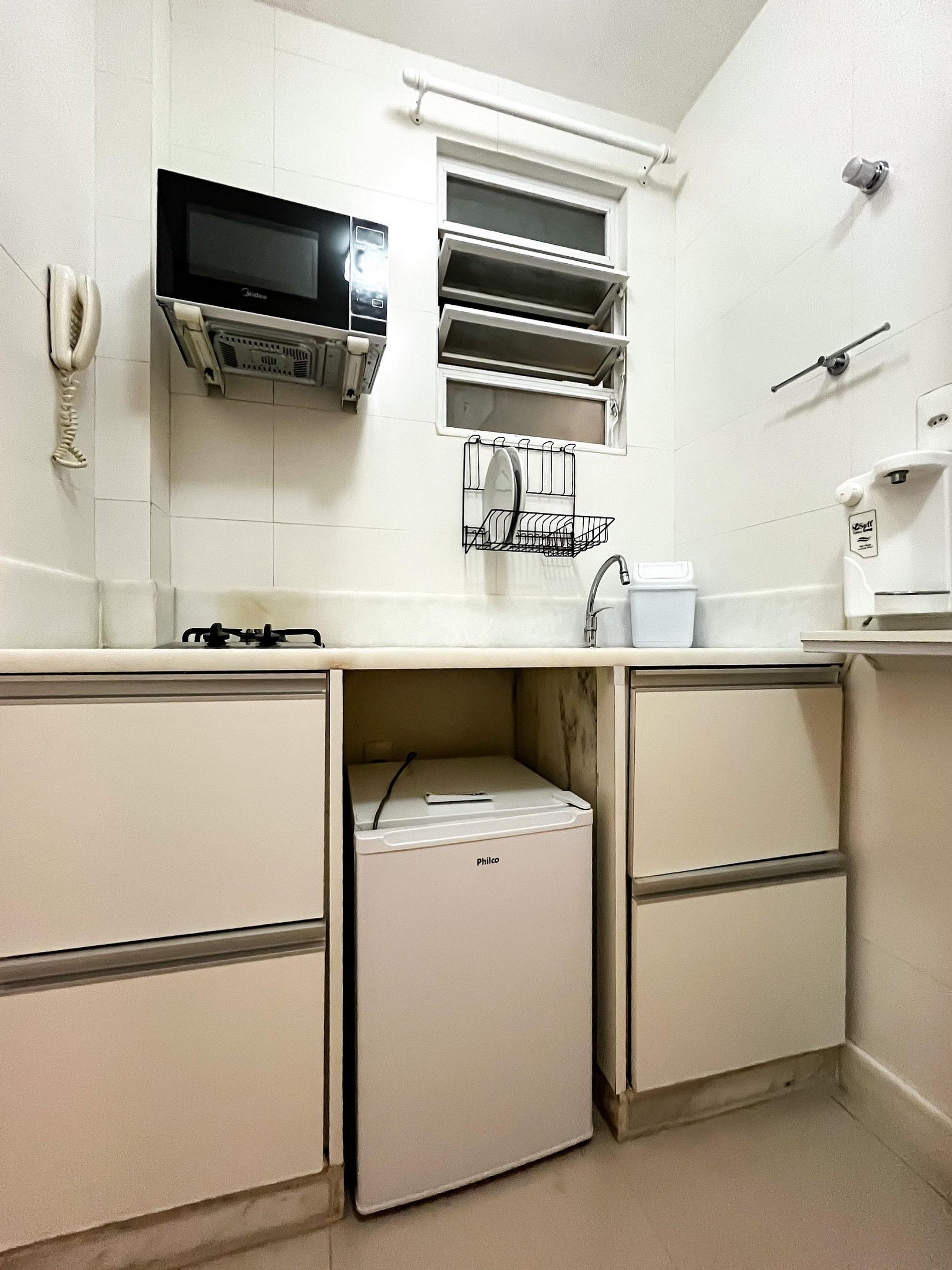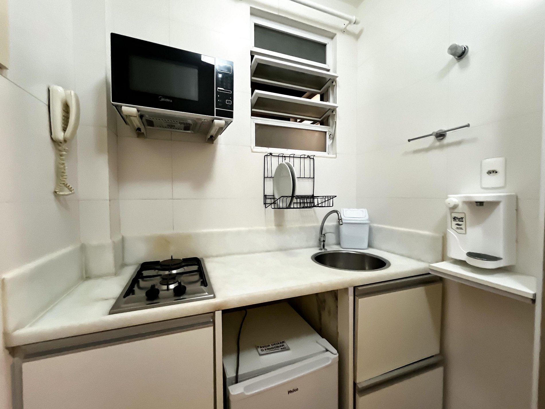 Possuímos uma cozinha compacta, porém completa, equipada com tudo o que você precisa para preparar as suas refeições após um dia cansativo de trabalho ou passeio pelo Rio de Janeiro.