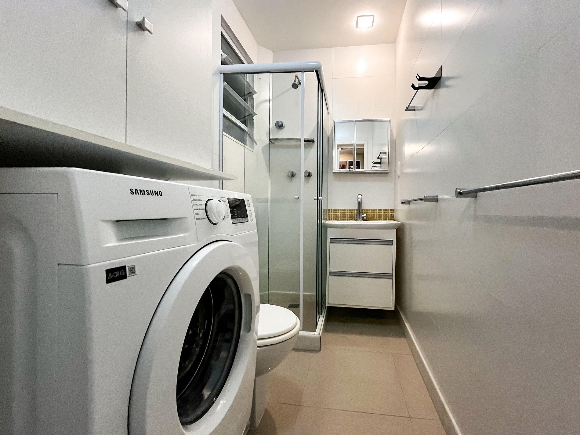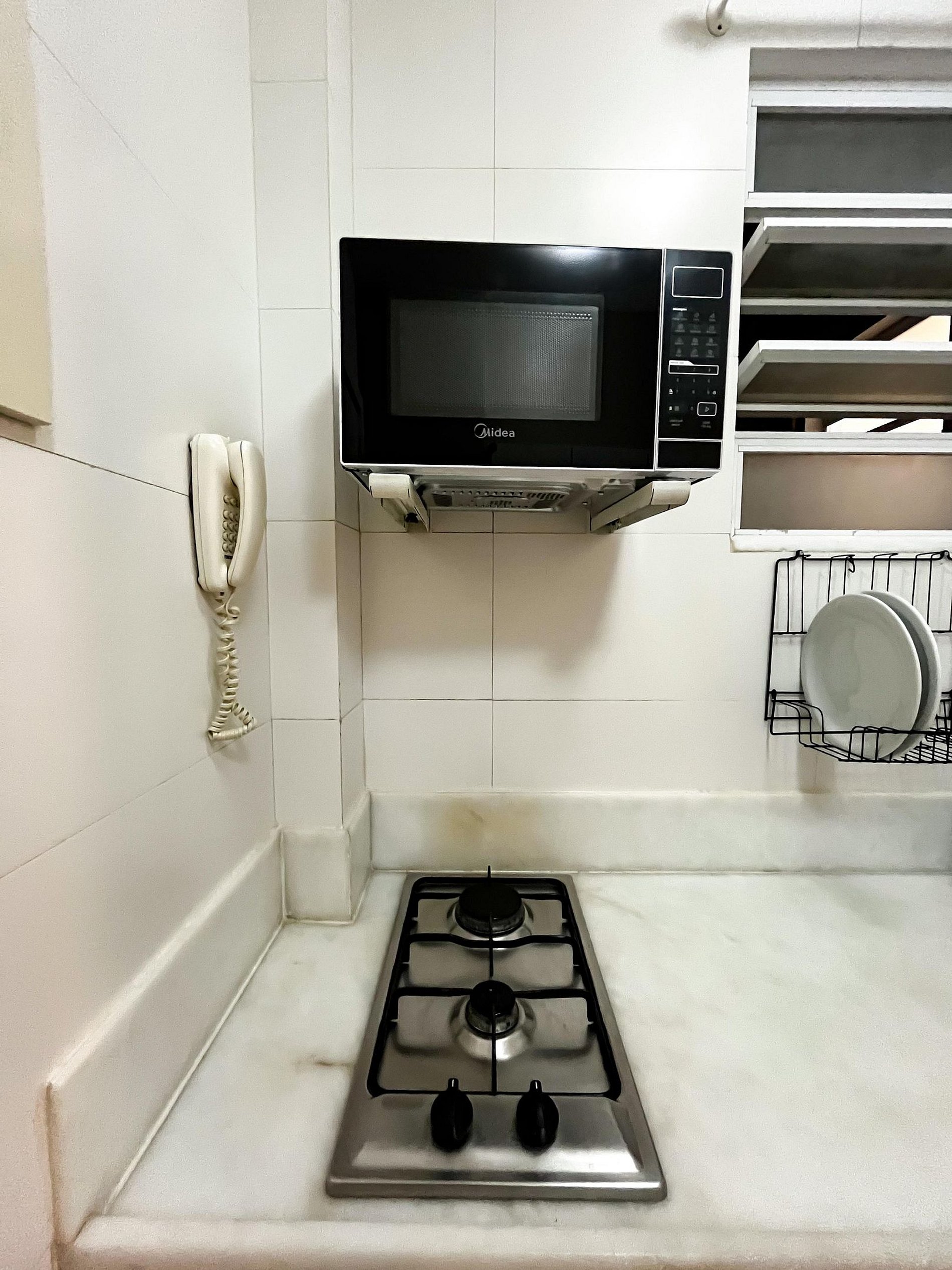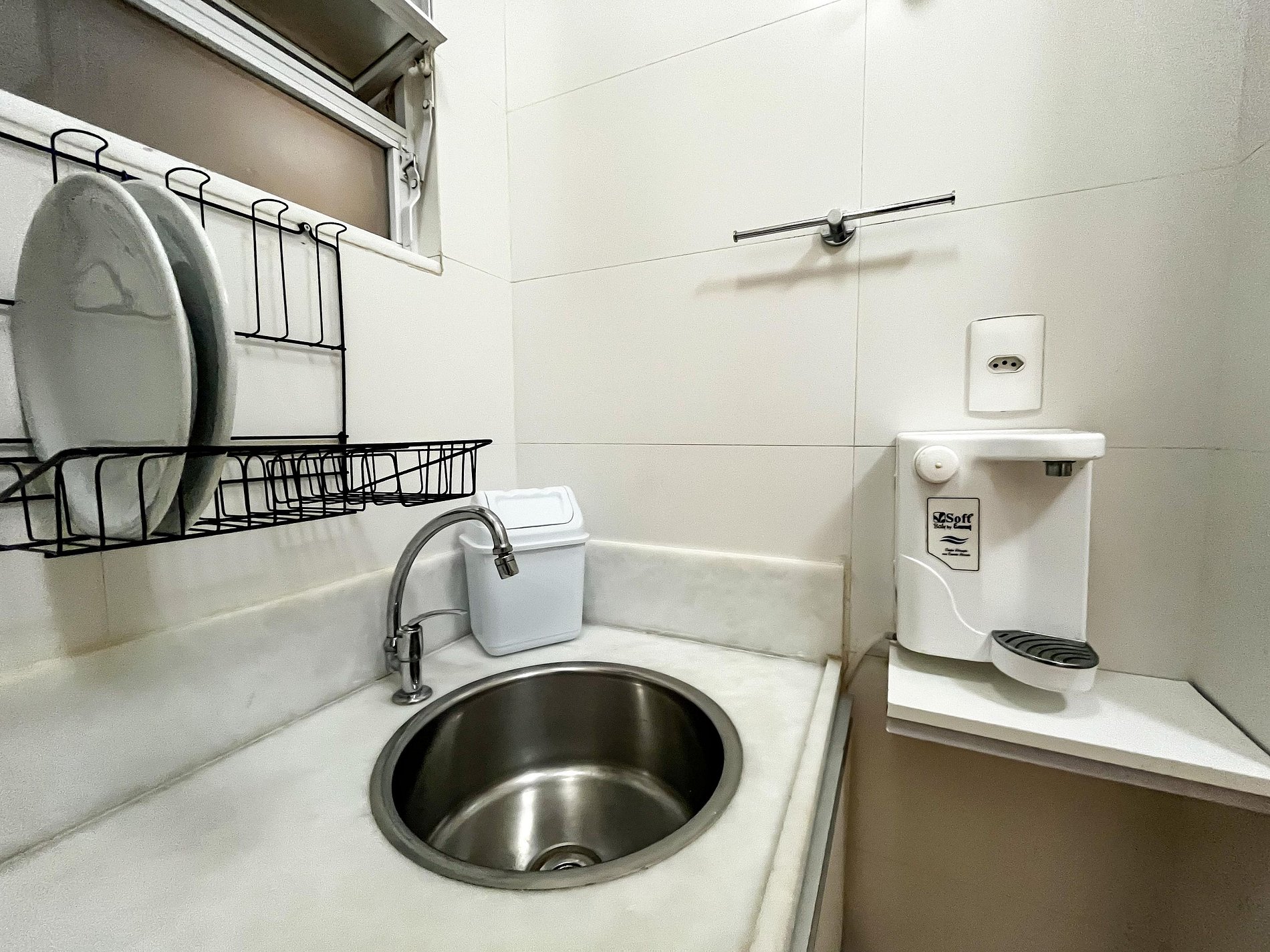Possuímos uma cozinha compacta, porém completa, equipada com tudo o que você precisa para preparar as suas refeições após um dia cansativo de trabalho ou passeio pelo Rio de Janeiro.