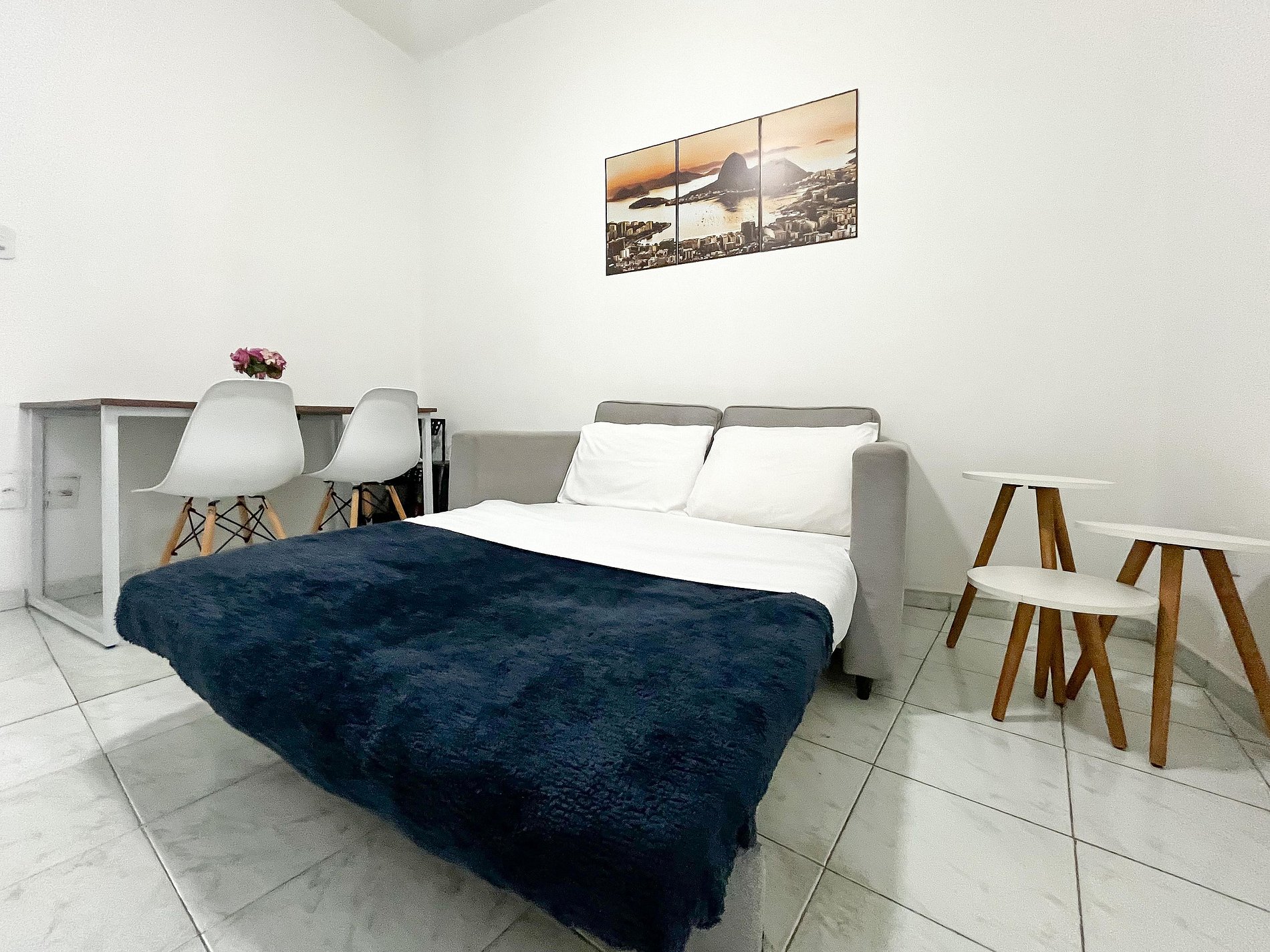 O apartamento acomoda até 3 pessoas pois conta com um quarto com cama de casal, uma sala com sofá-cama e mesa de jantar para duas pessoas, além de um espaço de trabalho ideal para quem precisa conciliar a estadia com tarefas profissionais.