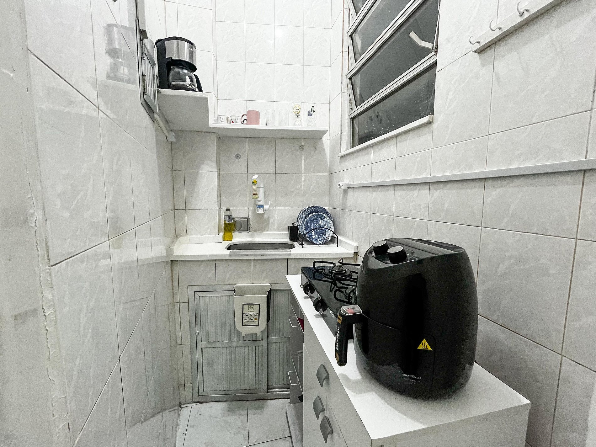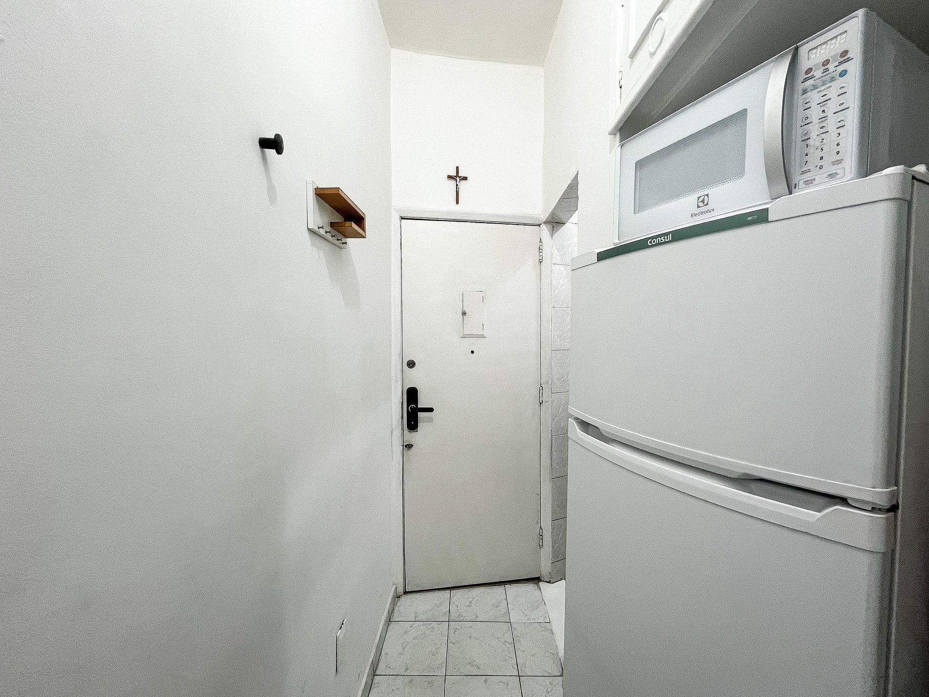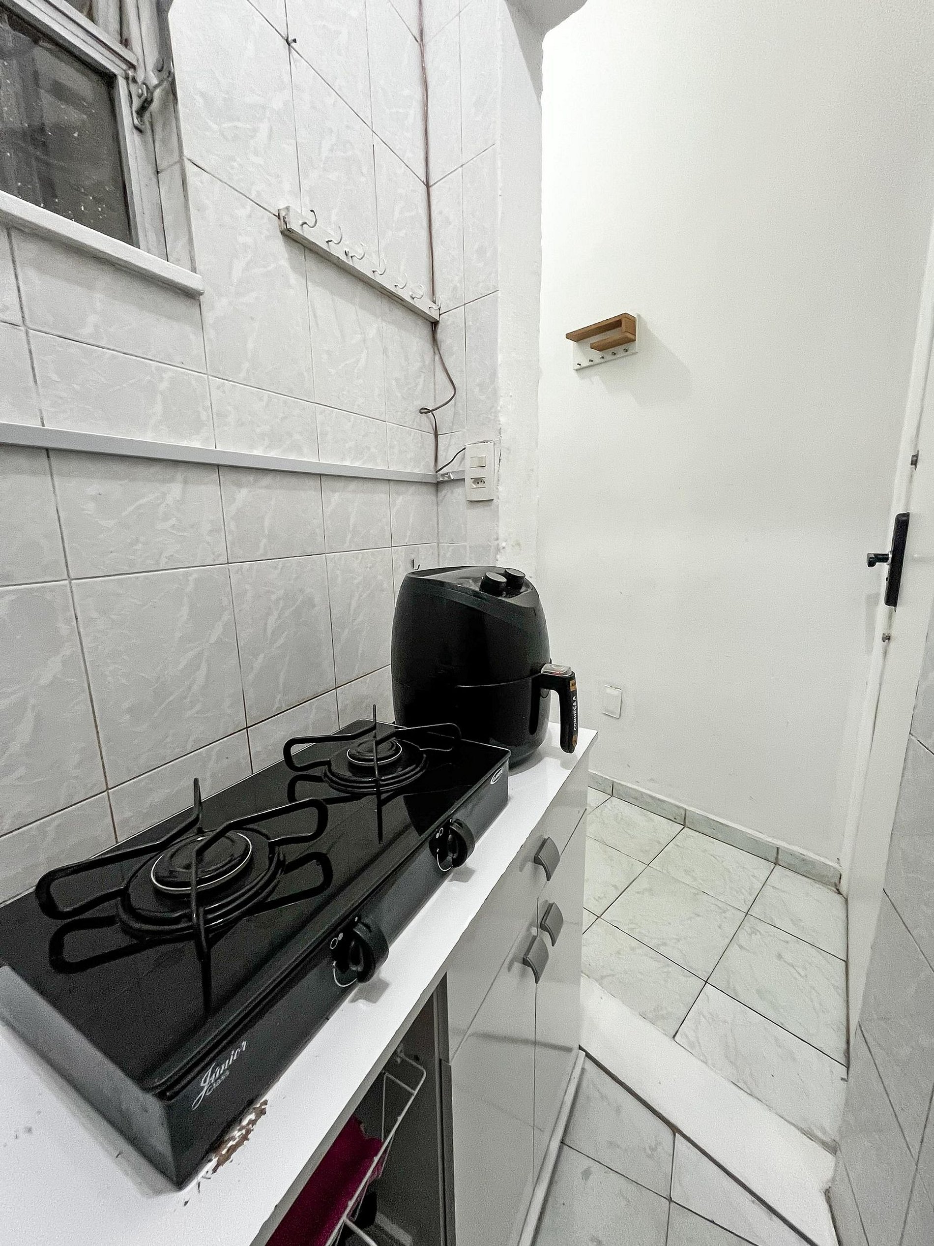 A cozinha é compacta, porém equipada com o essencial para preparar refeições rápidas. O prédio tem portaria 24h, oferecendo segurança e tranquilidade para sua estadia.